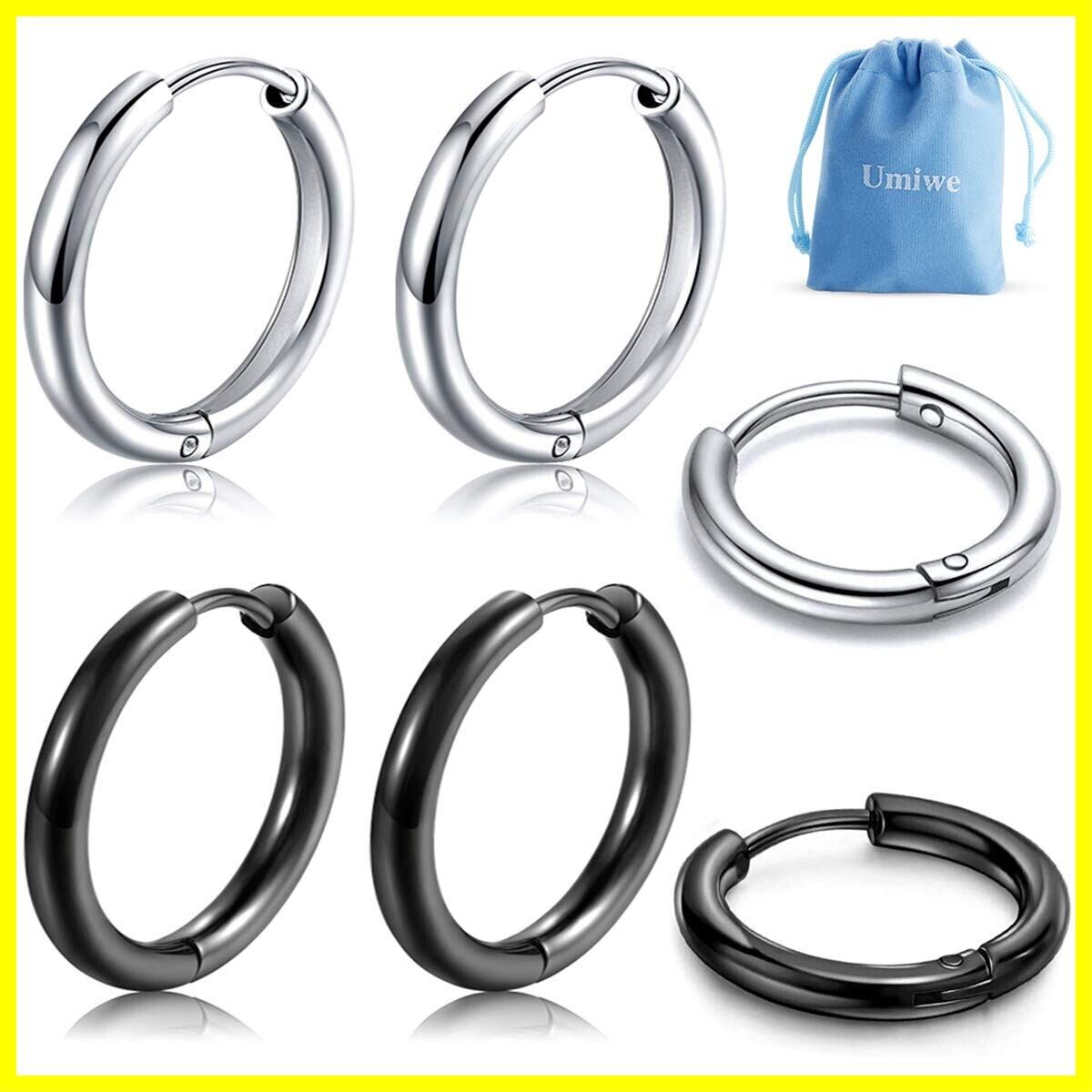 【お得な3ペア6個セット】シルバー 3個 &ブラック 3個、ステンレスピアス風で(両耳用 ピアス リング)。携帯に便利な収納ポーチ付き!人気の ステンレス ピアス シンプル デザインで。