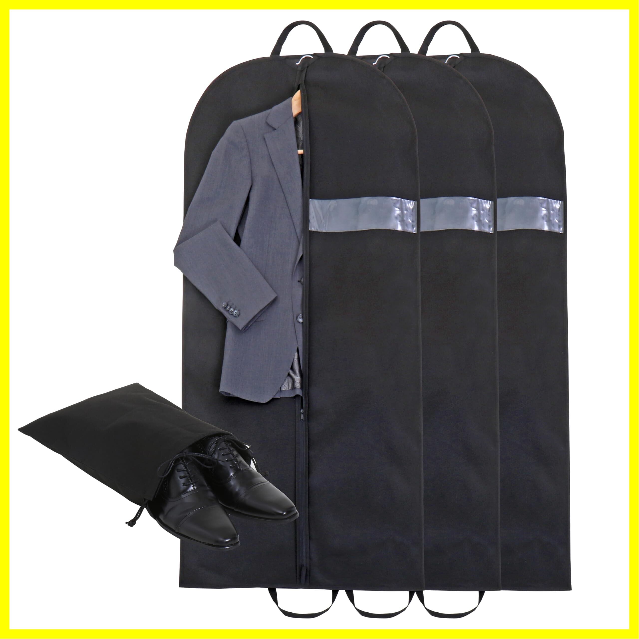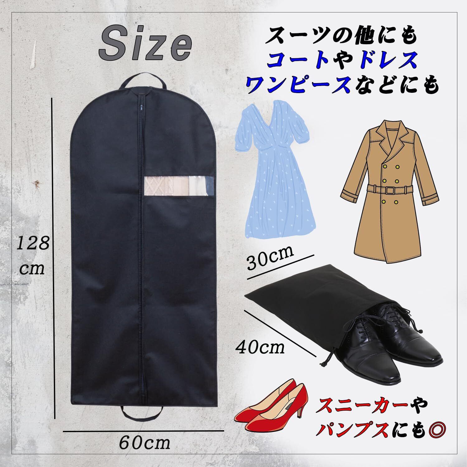 【商品仕様】:サイズ/スーツバッグ/約幅60×長さ128cm・シューズケース/約幅30×長さ40cm、内容/スーツバッグ3枚+シューズケース1枚、カラー/ブラック