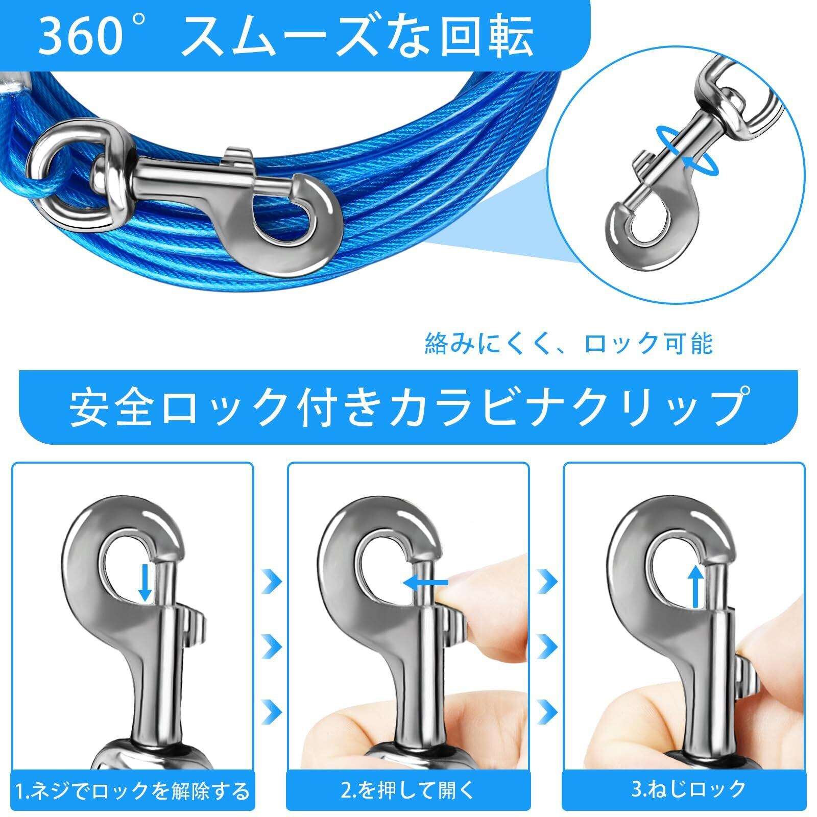 アドバンスド・クリップ:回転クリップは360°回転することができ、あなたの犬が絡まることなく移動するためのより多くのスペースを提供します。また、ペットがケーブルから外れて危険な目に遭うことも防げます。