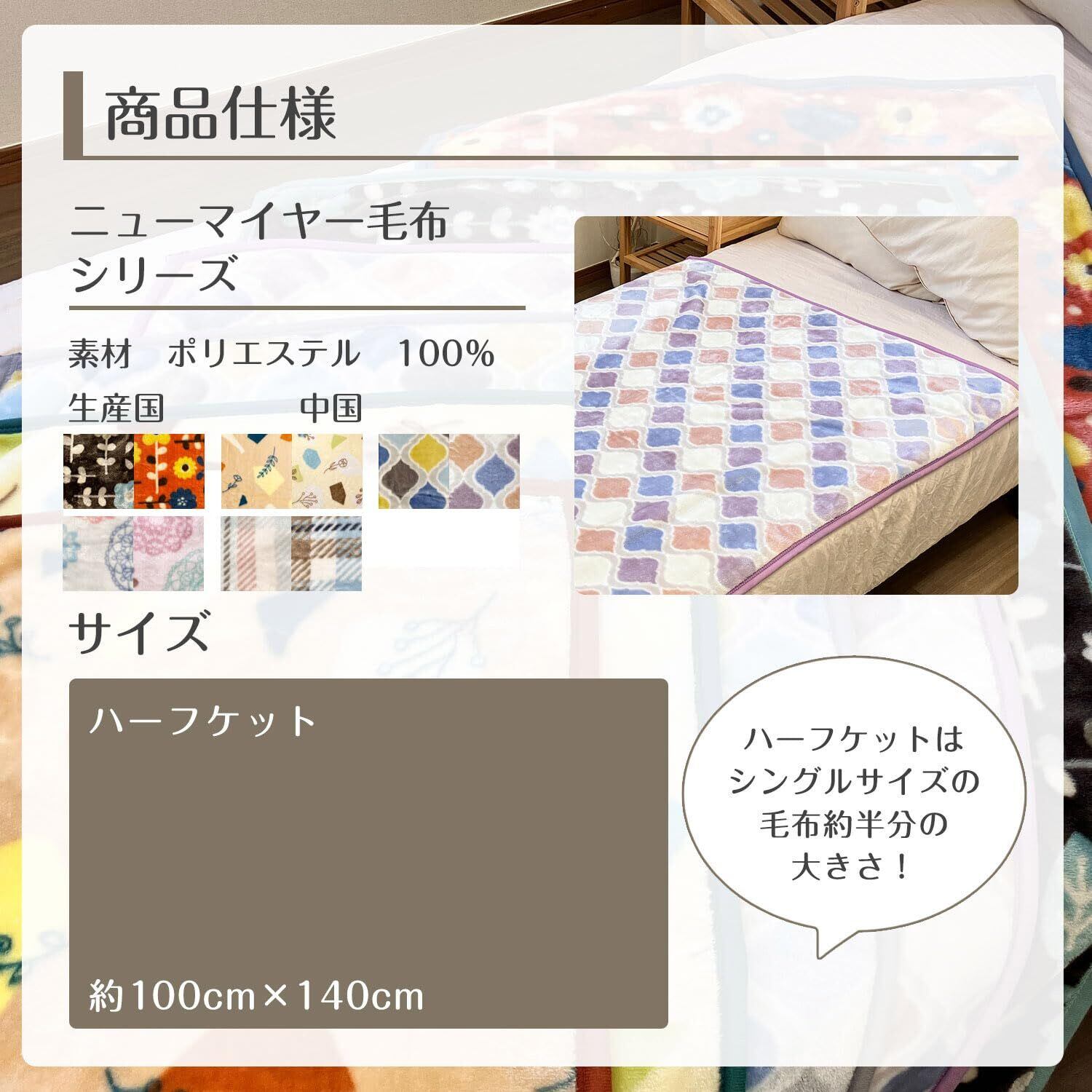 【商品サイズ】ひざ掛け 約70cm×100cm ハーフケット 約100cm×140cm シングル毛布 約140cm×200cm