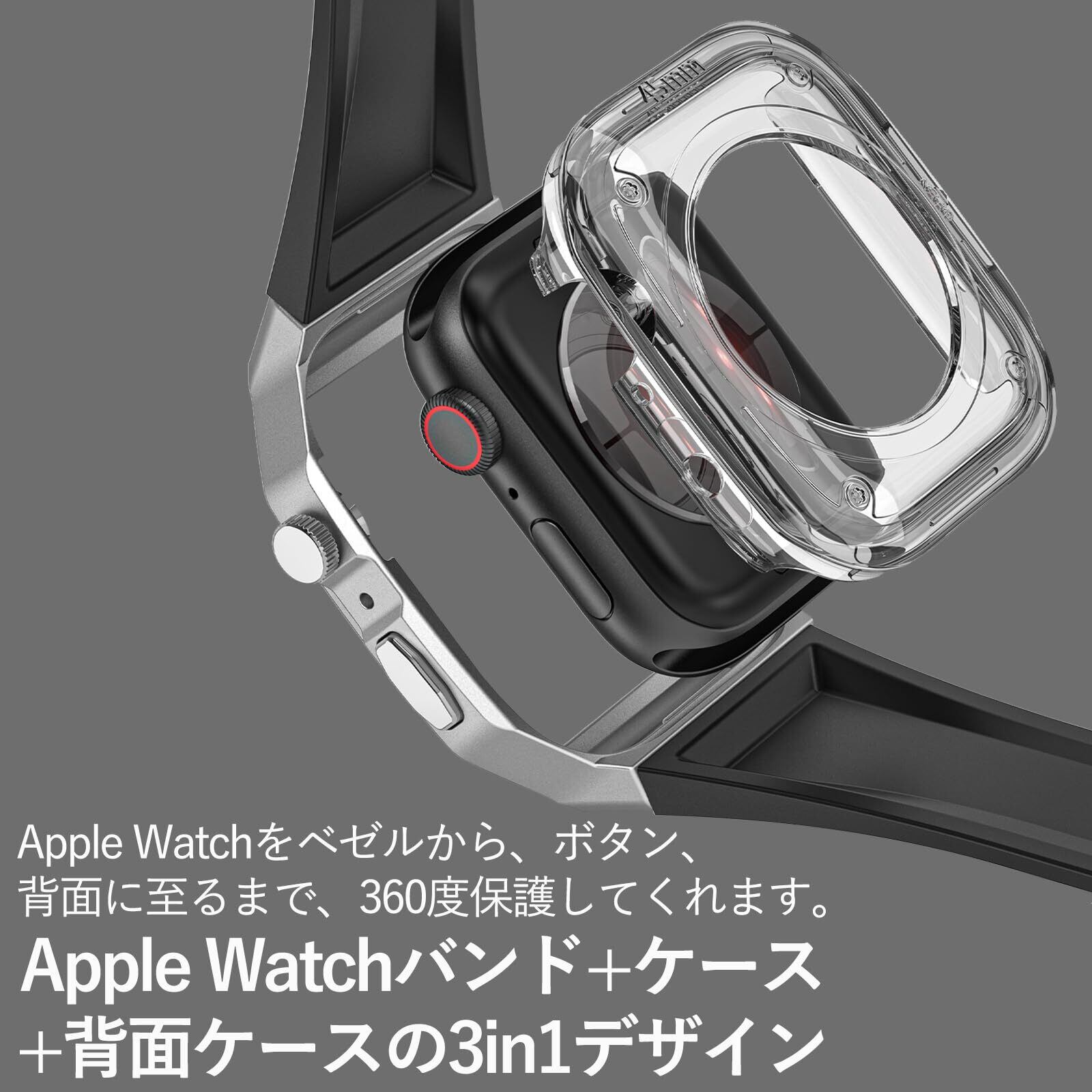 【Apple Watchバンド+ケース+背面ケースの3in1デザイン】本製品はApple WatchバンドとApple Watch保護ケース+Apple Watch背面ケースを一体化した3in1のデザインを採用しており、Apple Watchをベゼルから、ボタン、背面に至るまで、360度保護してくれます。メタル材質の保護ケースが落としてしまった時の傷などからApple Watchをしっかりと保護して、あなたのApple Watchを新しい姿にしてくれます!Apple Watch ケースには取り外しツールが同梱されています。取り外しツールを使って、Apple Watchを傷めることなく、簡単に取り付けと取り外しができます。(※液晶保護フィルムが付属しておりません。)