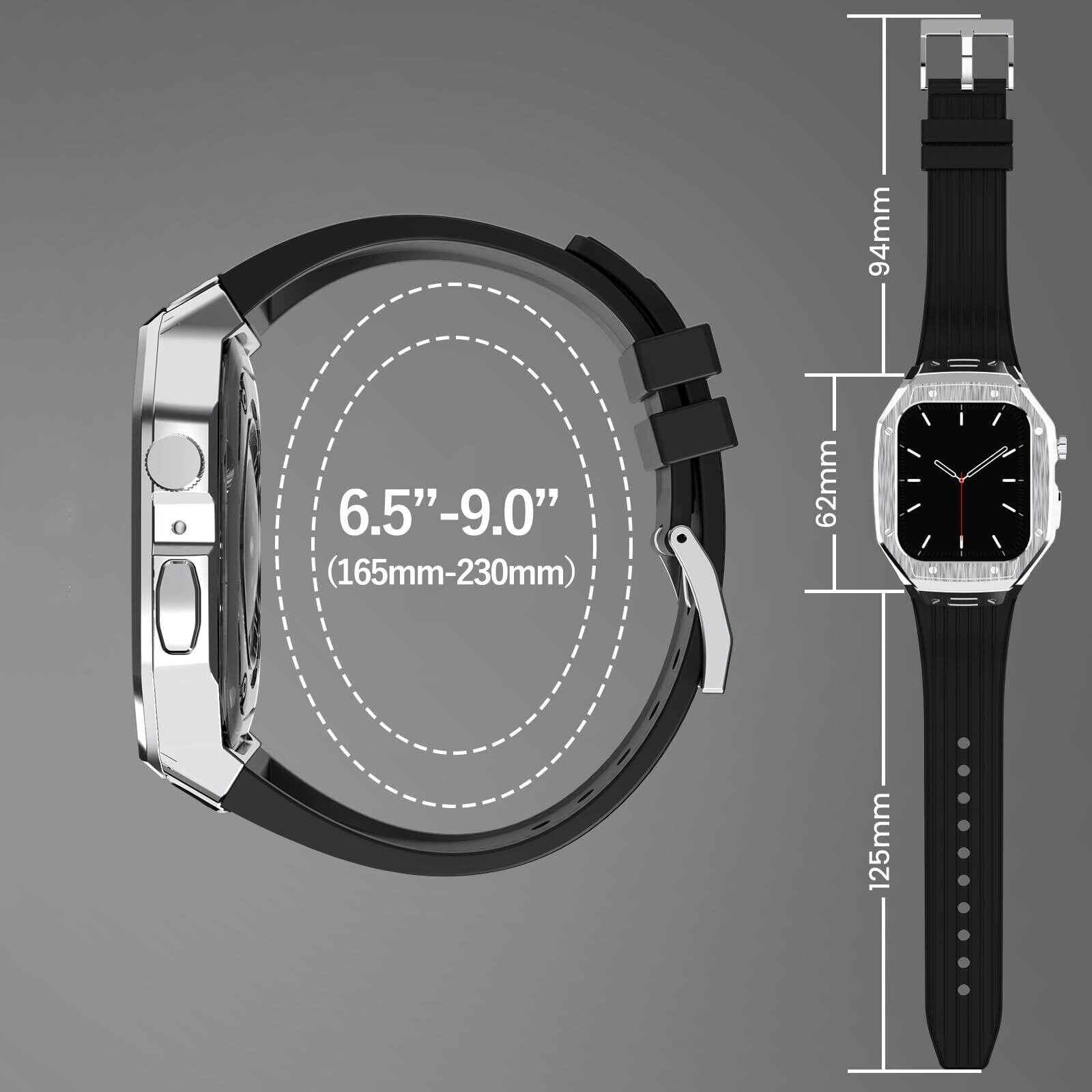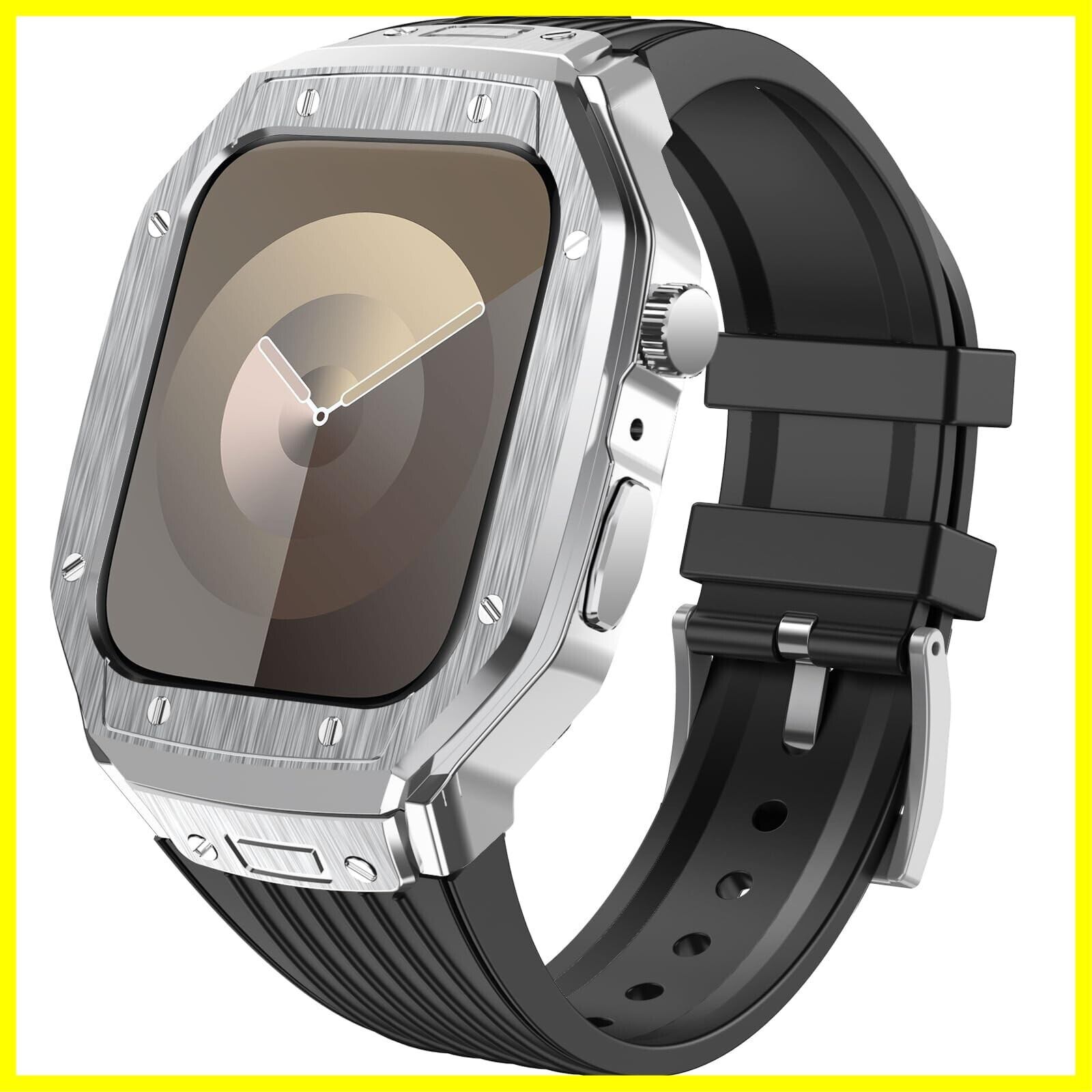 [YOFITAR] for Apple Watch バンドとケースと背面ケースの3in1一体型デザイン 45mm/44mm apple watch 一体型バンド Apple Watch Series 9/SE/8/7/6/5/4対応 メンズ かっこいい アップルウォッチ バンド カバー付き apple watch アクセサリー(45mm/44mm,シルバーケースとブラックベルト)