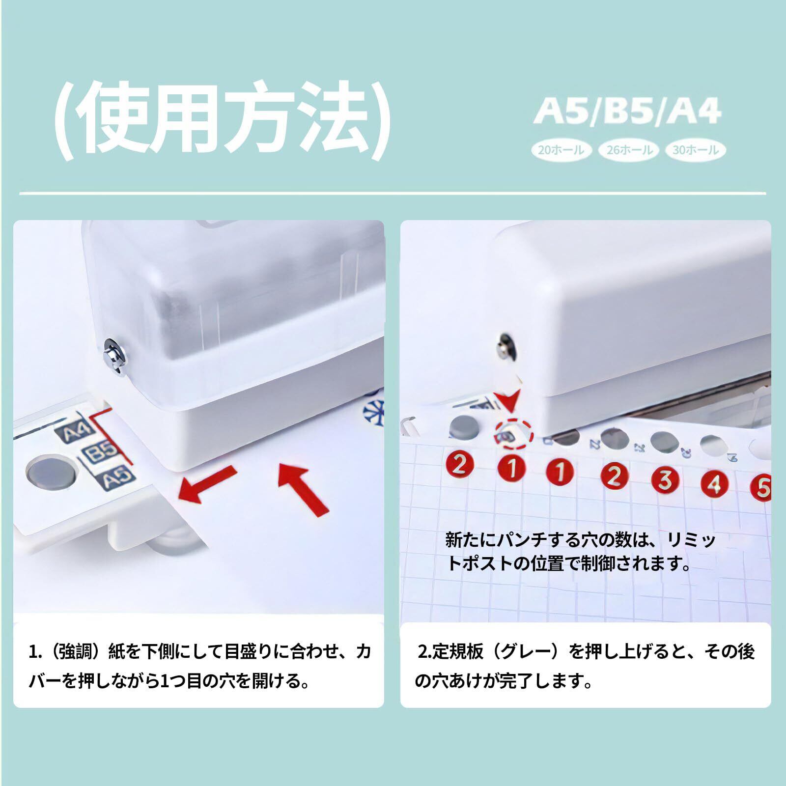 【使用方法】 ルーズリーフパンチ ルーズリーフパンチ (強調)紙を下側にして目盛りに合わせ、カバーを押しながら1つ目の穴を開ける,定規板(グレー)を押し上げると、その後の穴あけが完了します,新たにパンチする穴の数は、リミットポストの位置で制御されます。A4(30穴)/A5(20穴)/B5(26穴)のパンチングについては、画像で説明をご覧ください。