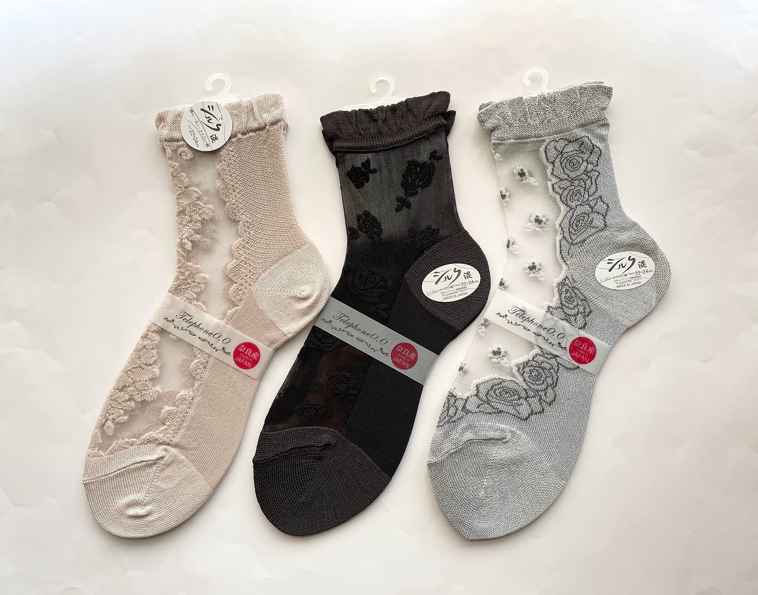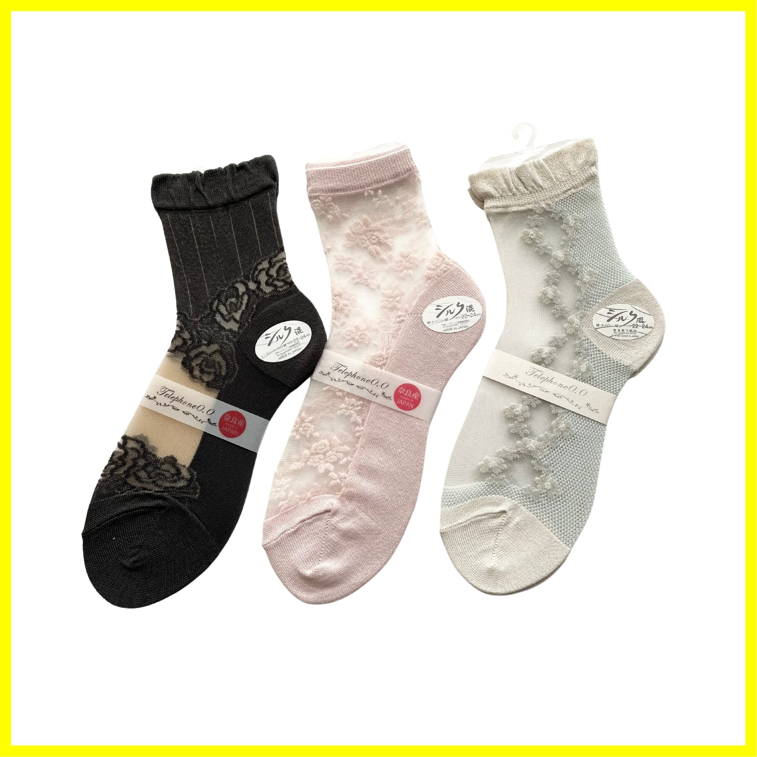 日本製 靴下 レディース 夏用 かわいい シースルー ソックス 絹 シルク混 ソックス 薄手 おしゃれ 22-24cm 3足セット(柄はお任せ)