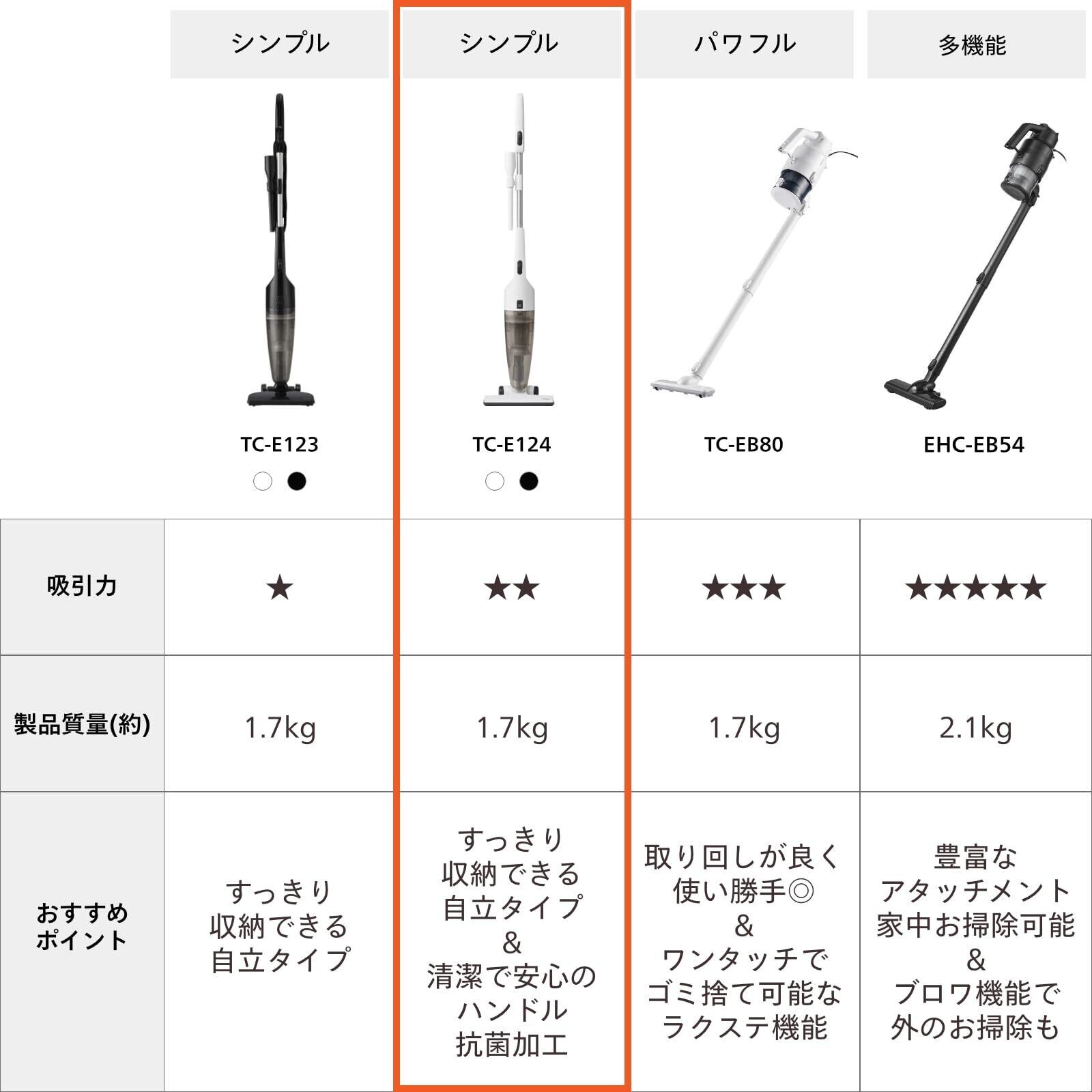 TC-E124は、軽量1.7kg、吸込仕事率100Wの軽さとパワーを兼ね備えた、シンプルなスティッククリーナーです。ハンドルを外せば、ハンディクリーナーとしても使える2WAY仕様。スティックの時もハンディの時も手元にスイッチが来るよう、配置を工夫しました。シンプルな使いやすさを追求した、一人暮らしにおすすめの掃除機です。This stick cleaner is a 2 way stick cleaner that combines lightness and power with a weight of 1.7kg and a suction power rate of 100W. If you remove the handle, you can use as a handy cleaner. Switch can be at hand whether it is a stick or a handy. This stick cleaner is the perfect cleaning companion for your tiny house to live in.