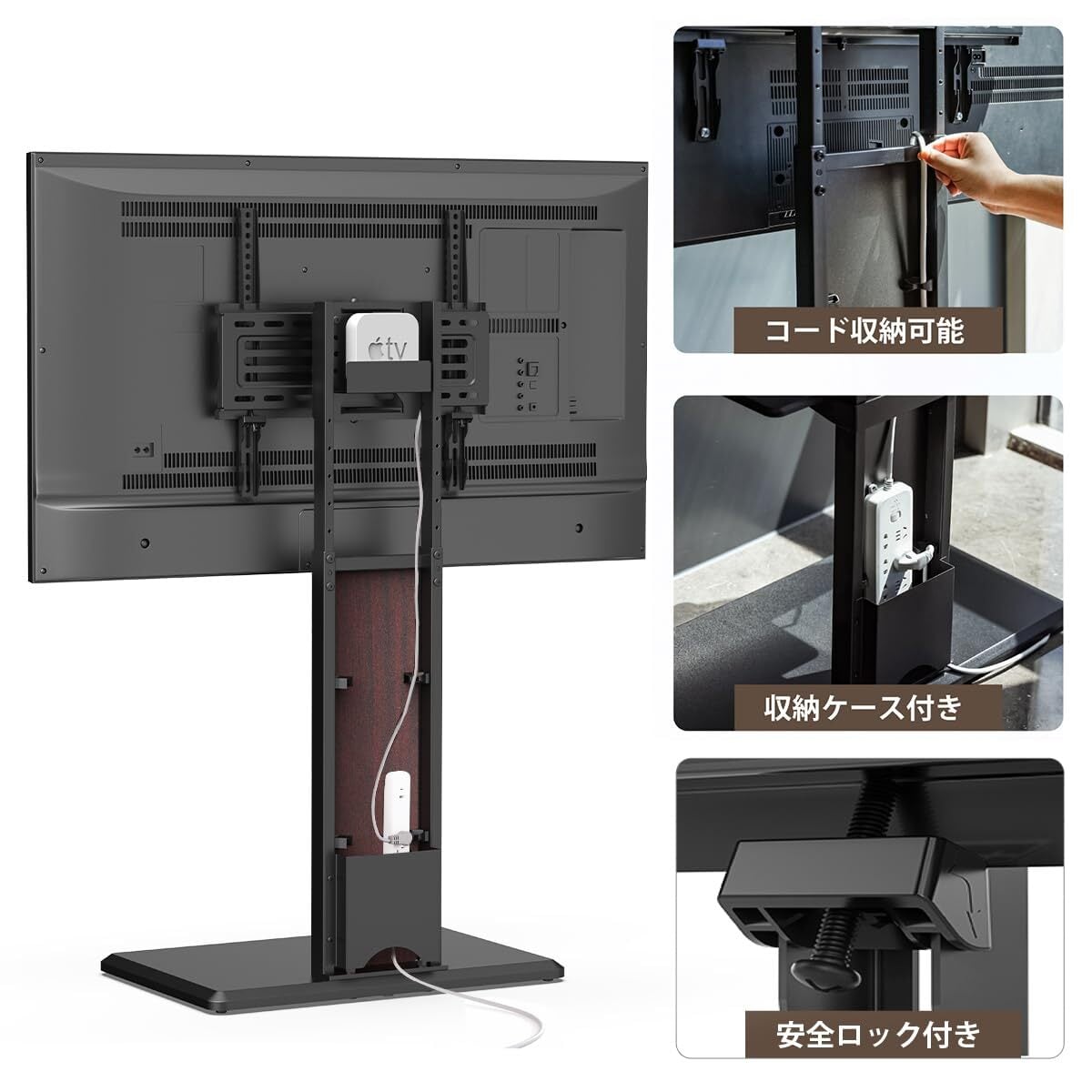 【調整機能付きロータイプスタンド】正面だけでなく、屋内ほかの位置から見やすいため、首振り部品を装着する場合、左右に各20°調節できます。また、ロータイプテレビスタンドは視線に合わせて、947~1207mmの幅広い調整範囲で高さを調整できます。テレビスタンドの背面にケーブル整理、コンセント設置の部品とHDDホルダーが付き、見た目がスッキリです。
