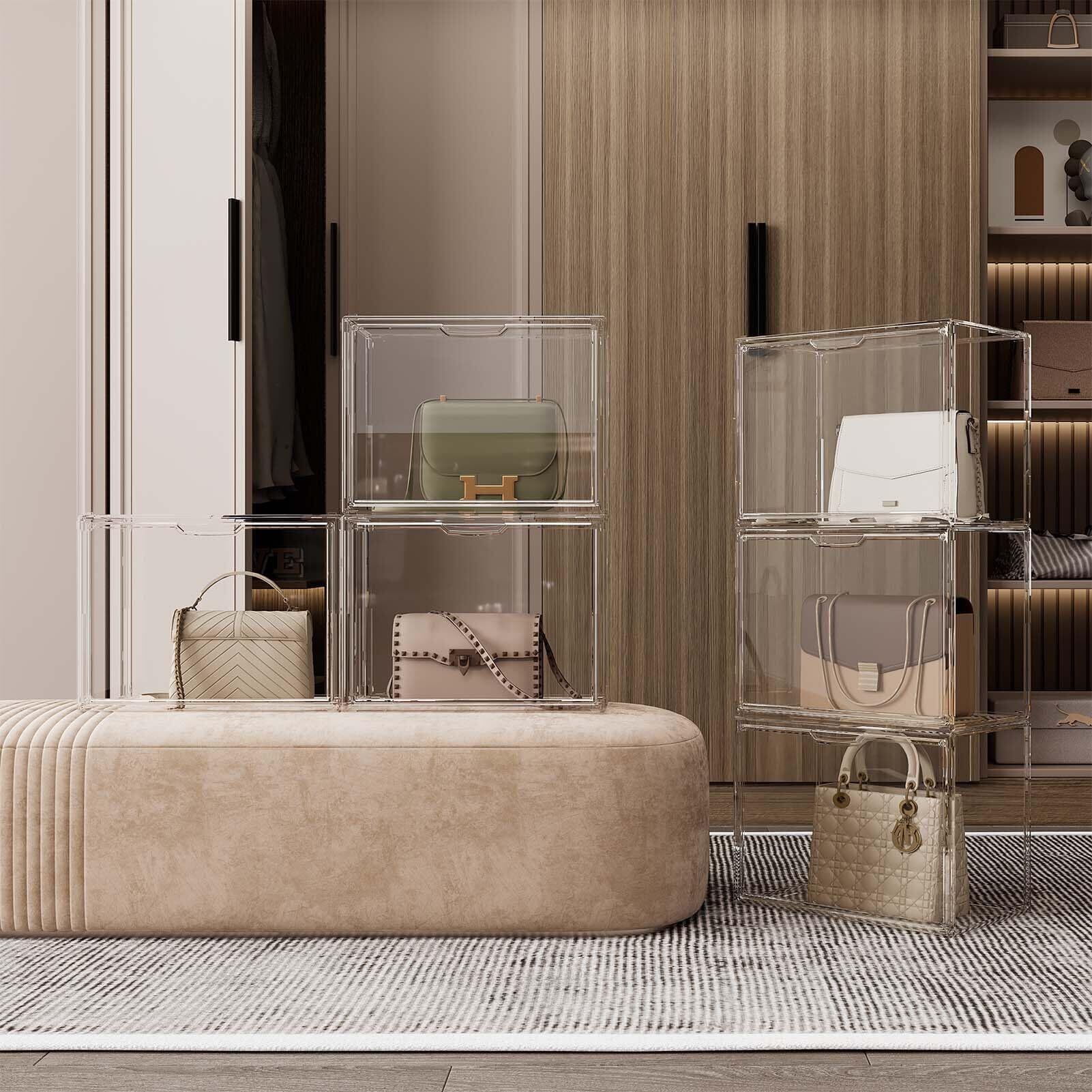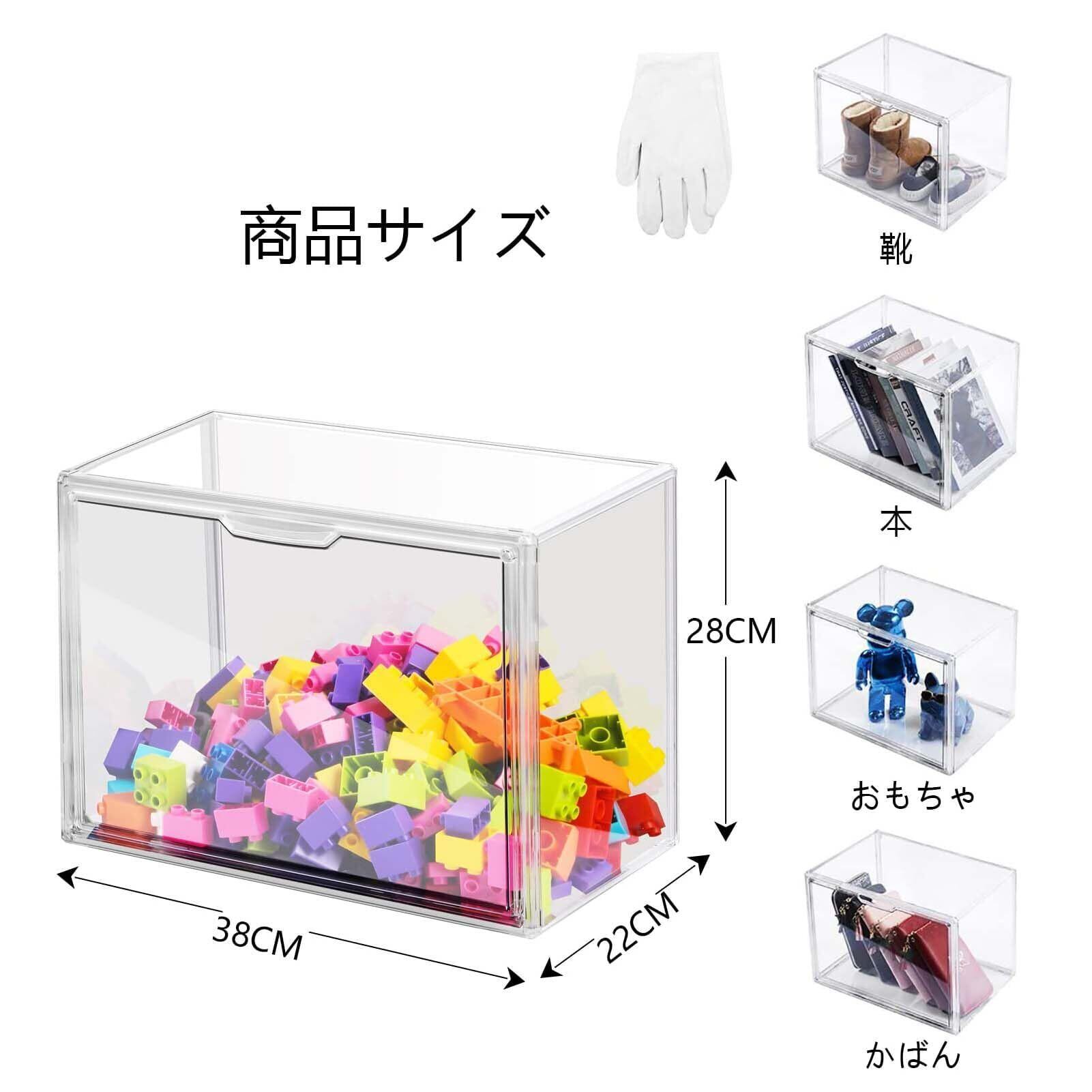 透明の収納ケース3つ 積み重ね式 プラスチックのマグネット式 前開き おもちゃ・かばん・財布・靴・書類の収納ボックス・ディスプレイ用 約36cm(幅)x22cm(奥行き)×28cm(高さ)