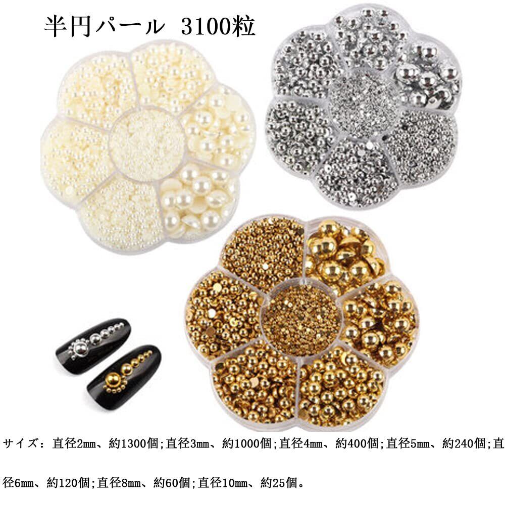 【サイズ】:直径2mm、約1300個;直径3mm、約1000個;直径4mm、約400個;直径5mm、約240個;直径6mm、約120個;直径8mm、約60個;直径10mm、約25個。合計約3100個。大容量のお得のネイル用半球パールセットです。