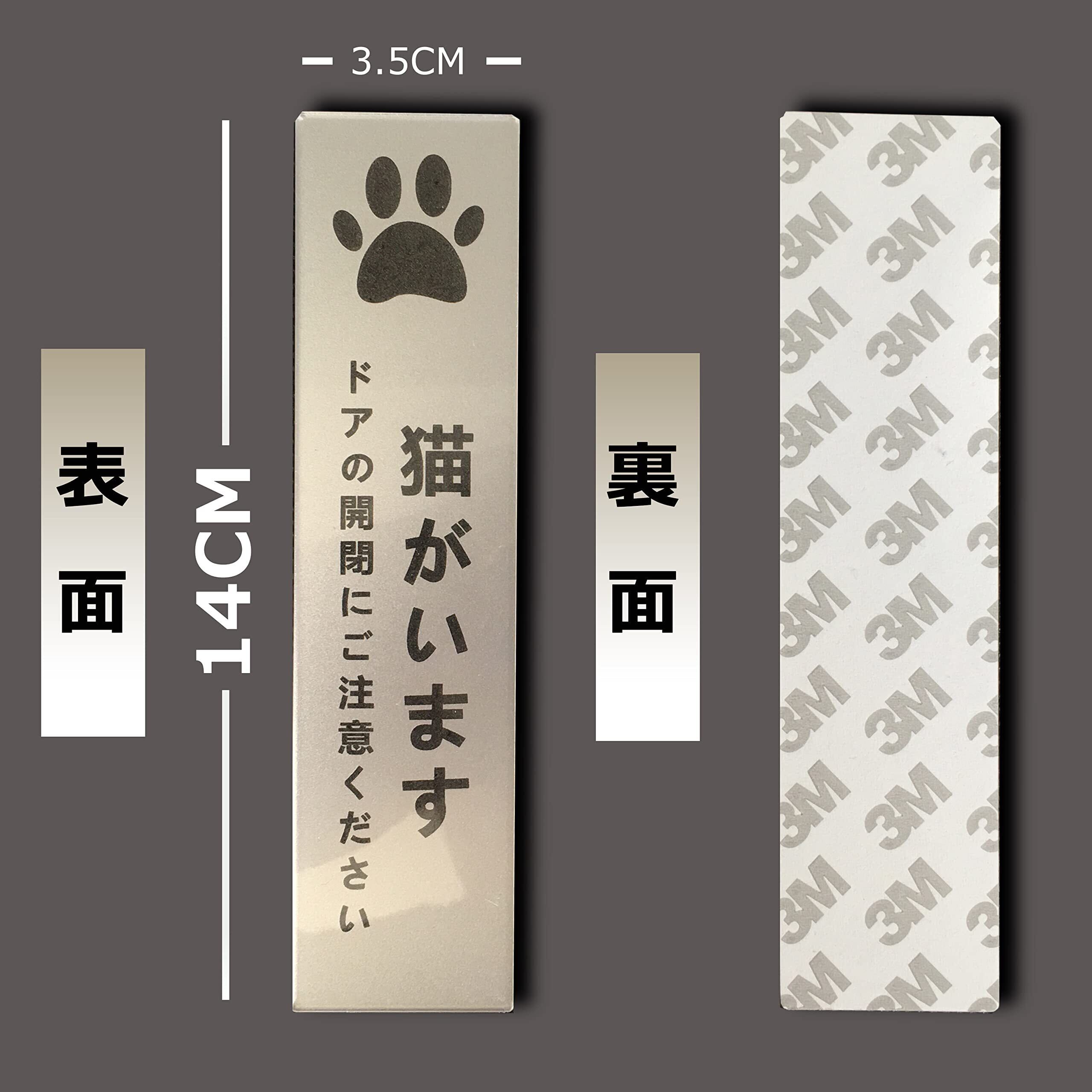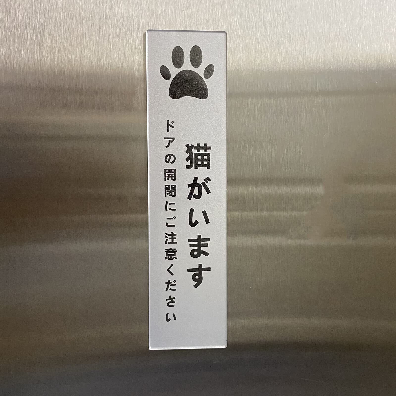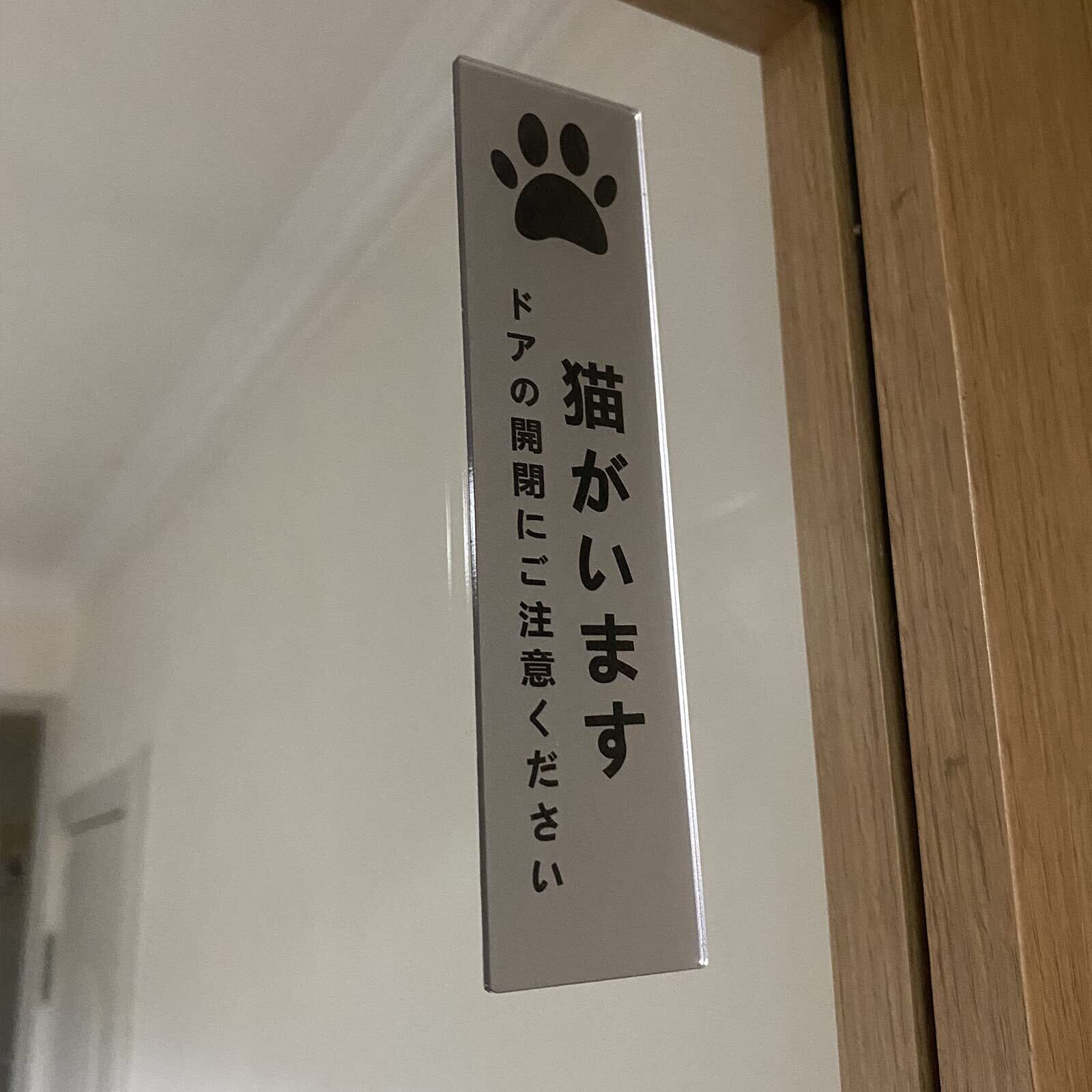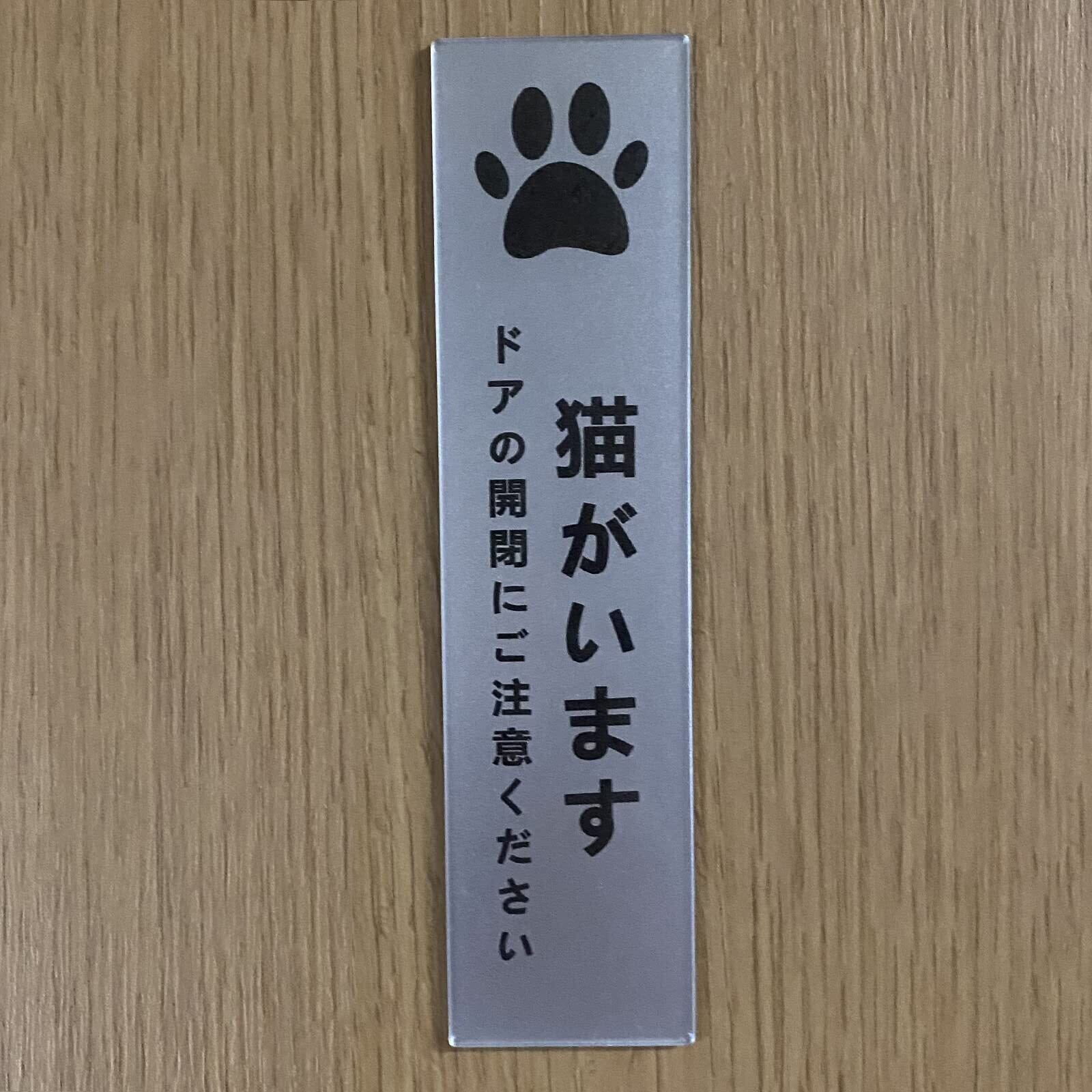 猫がいます タテ型 サインプレート 両面テープ付き ペット 飛び出し 脱走 防止 ステッカー シール シルバー色 2㎜アクリル製 玄関 おしゃれ 14×3.5㎝ (1枚入り)