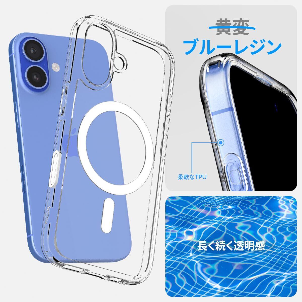 【透明さを守り抜く】黄変を抑制する特殊素材を採用しており、黄変を防ぎます。TPU(熱可塑性ポリウレタン)には補色を応用し作り上げられた『デュラクリア』が使用され、黄変を最小限に抑制しました。
