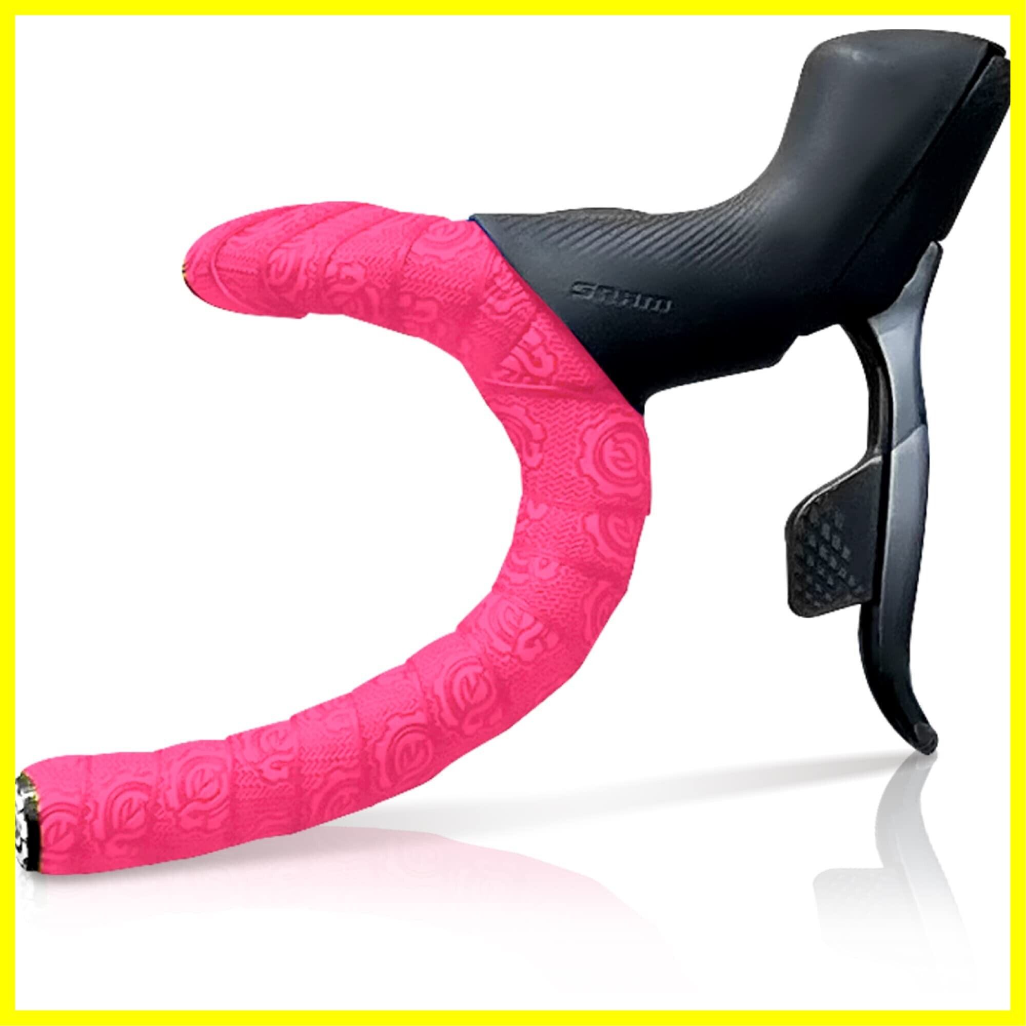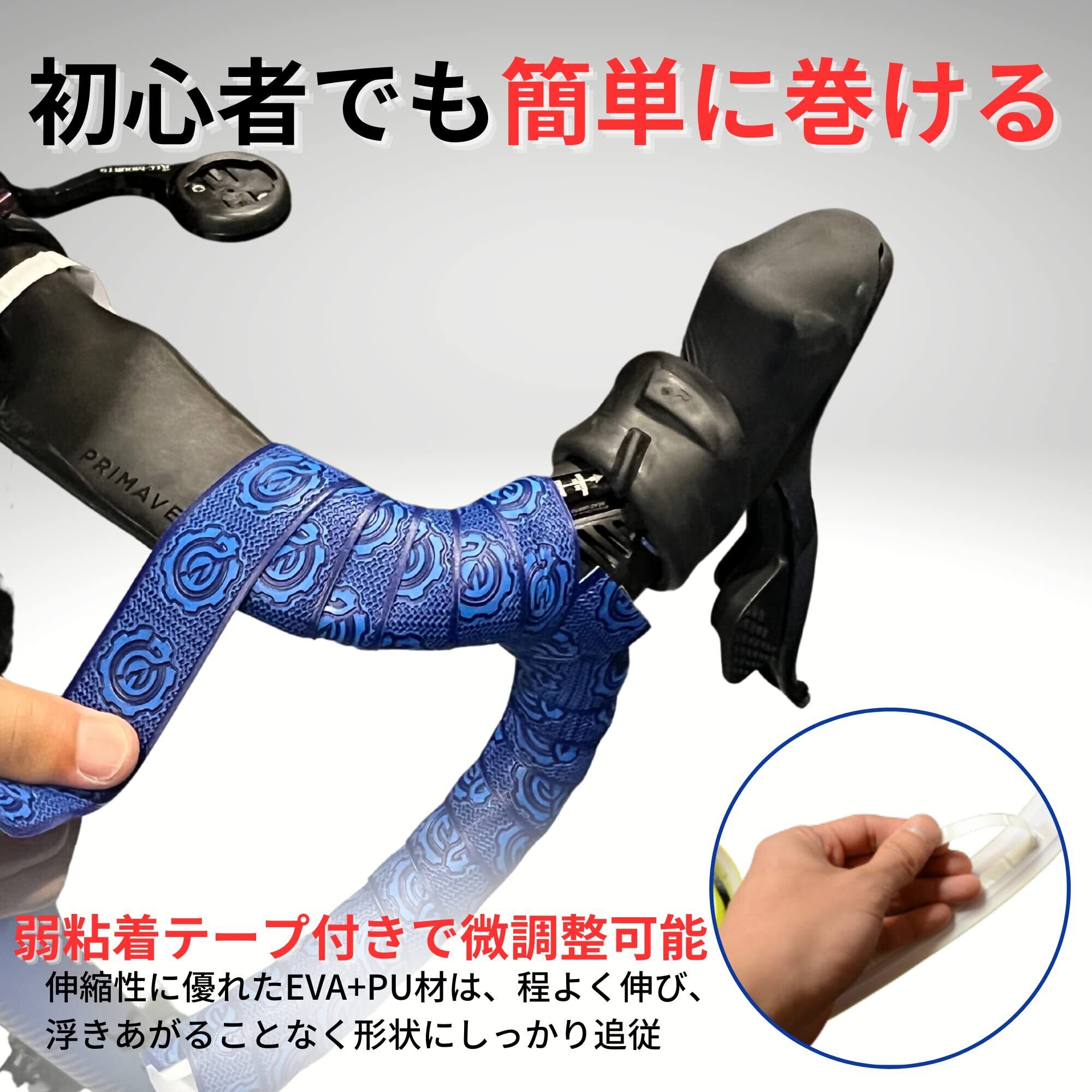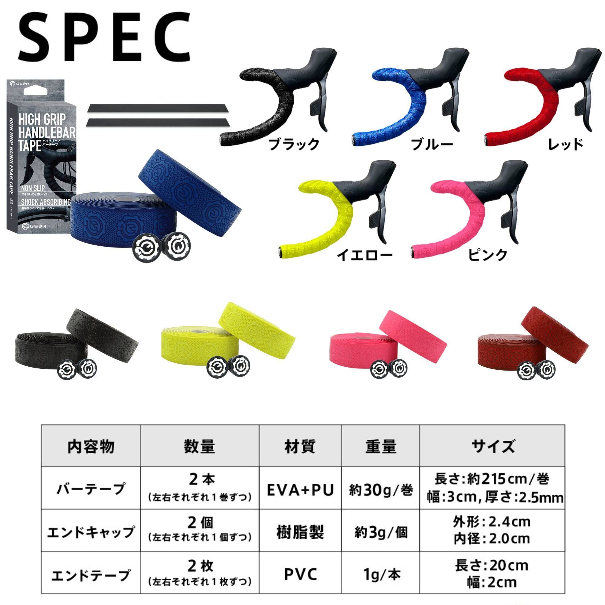 【商品内容】:バーテープ×2巻、エンドキャップ×2、エンドテープ×2 【カラー展開】本製品はロードバイクやクロスバイクに使用可能なバーテープです。カラーは黒、青、黄、赤、ピンクの5種類。 【仕様】耐水性、耐衝撃性に優れたEVA+PUレザーを採用。厚みは2.5mmなので地面からの振動を吸収し、伝わりにくくします。 【グリップ力】グリップ力の高いグリップテープなので、汗や雨で手が滑りにくい仕様になっております。また、水はけ性能を高めるデザインパターンを採用しているため、バーテープ表面に水分が残りづらいため、安定したグリップが得られます。 【衝撃吸収】適度なクッション性を持たせたバーテープは、ロングライドでも疲れにくい仕様となっております。 【樹脂エンドキャップ】樹脂製のエンドキャップを採用しているので工具が不要!ハンドルの先端から押し込むだけで装着完了 【巻き易い】柔らかく伸びやすいテープなので、R部なども伸ばしながら綺麗に巻くことが可能。 【注】ご使用のモニタ環境によって、実物と色味が異なって見えることが御座います。 【注】パワーライド重視や薄めのバーテープをお探しの方には向きません。