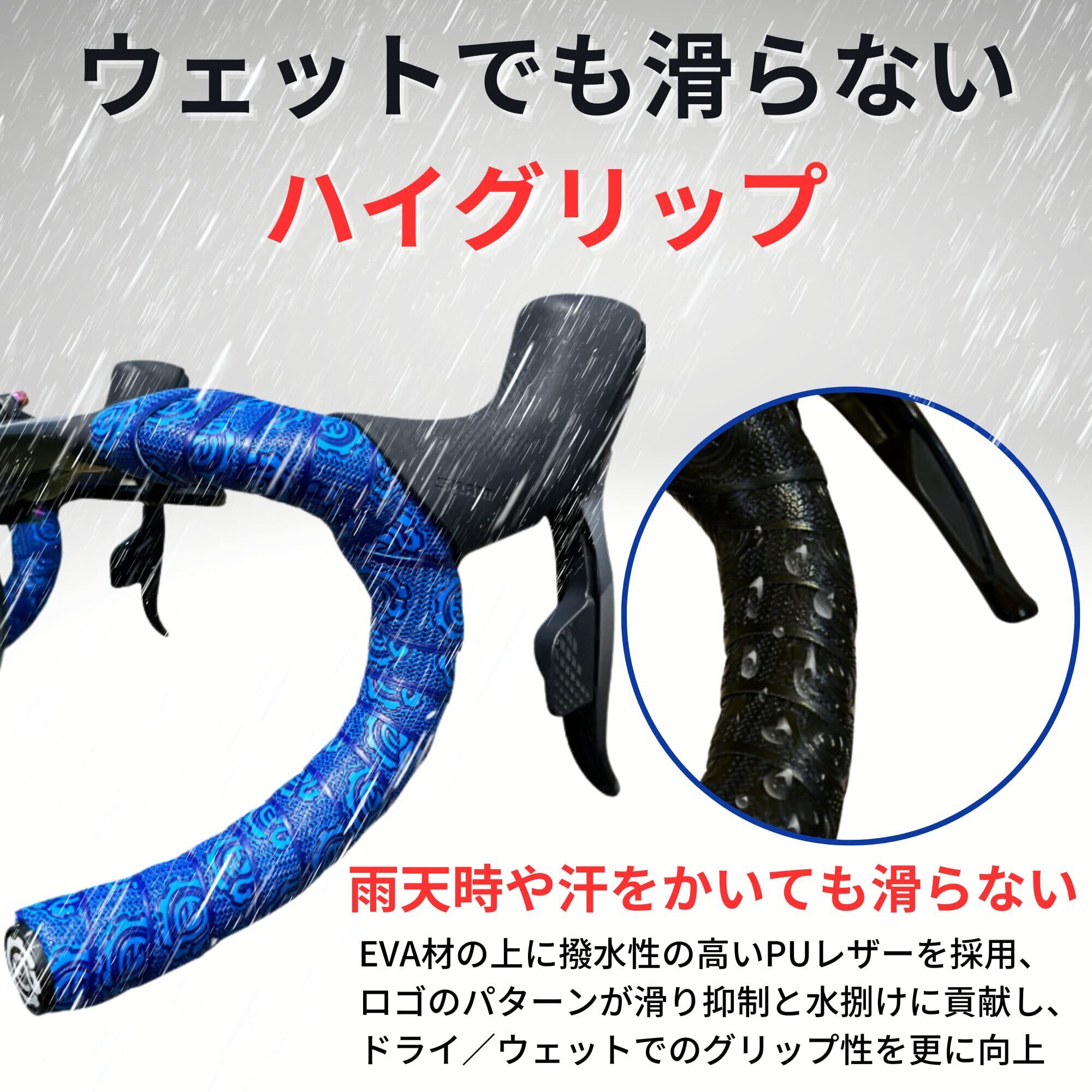 【グリップ力】グリップ力の高いグリップテープで、汗や雨でも手が滑りにくい設計です。水はけ性能を高めたデザインパターンにより、バーテープ表面に水分が残りづらく、安定したハンドルグリップが得られます。