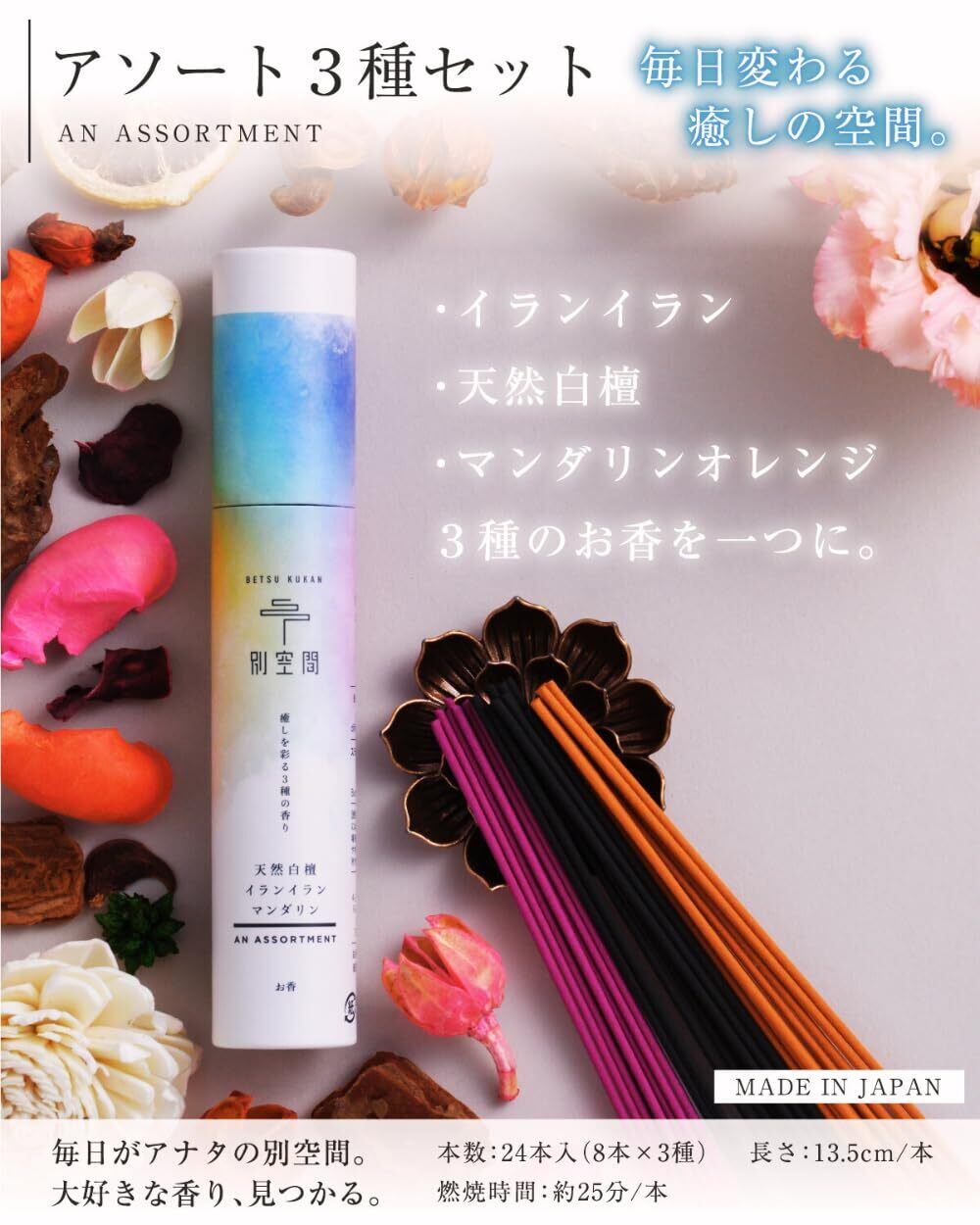 ️内容量:24本(8本✖️3種) ️原産国:日本️香り:白檀・イランイラン・マンダリンオレンジ️長さ:13.5cm️燃焼時間:約25分