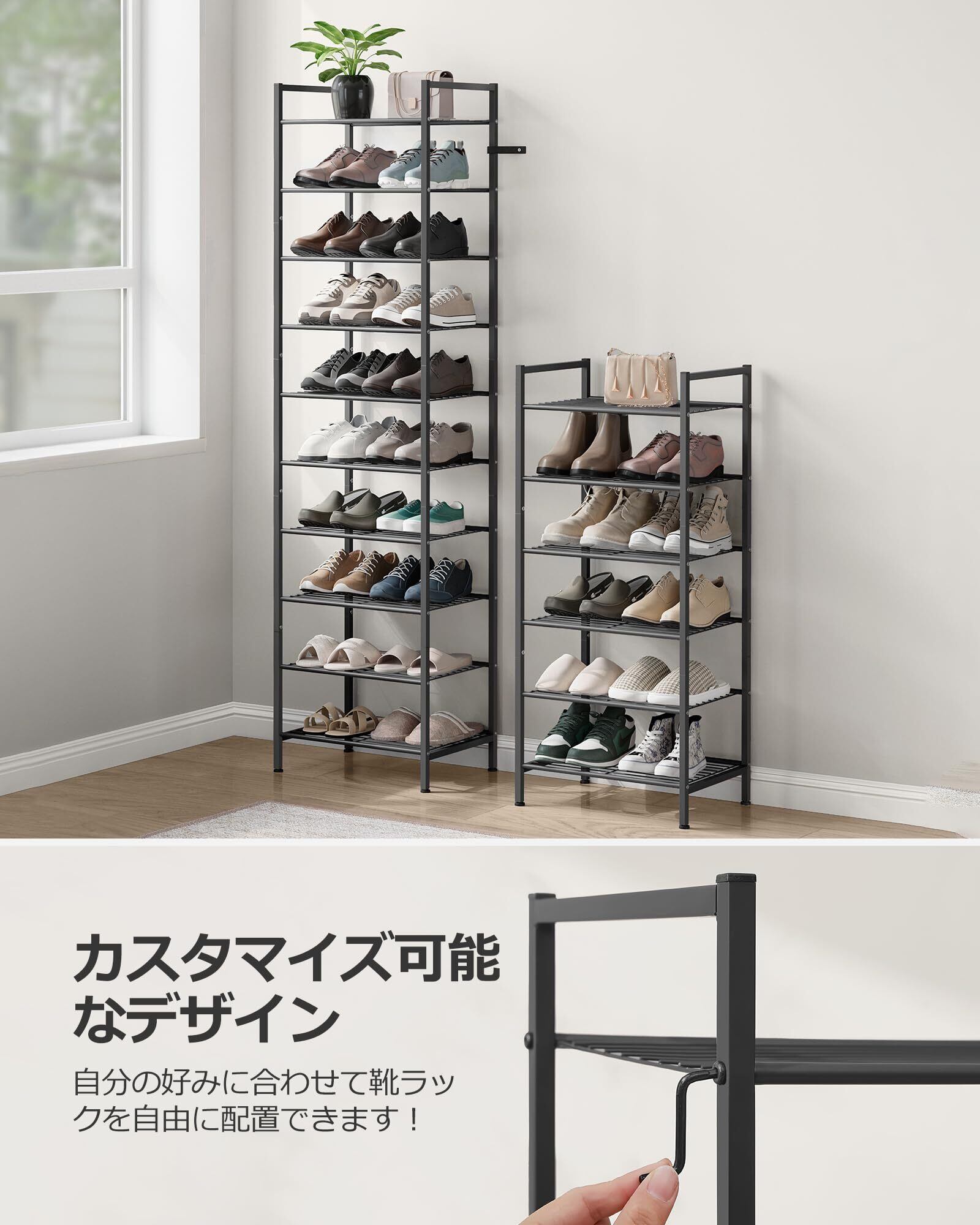 【調整可能&積み重ね可能な靴ラック】当社の8段階シューラックタワーを2セット追加し、垂直に分割して積み重ねることで、完全な10段階シューラックと6段階シューラックを作成できます。4つの調整可能なアジャスターを追加することで、より多くの靴を収納できる追加の下部収納スペースを作成し、スペースを最大限に活用し、収納機会をさらに創出します。