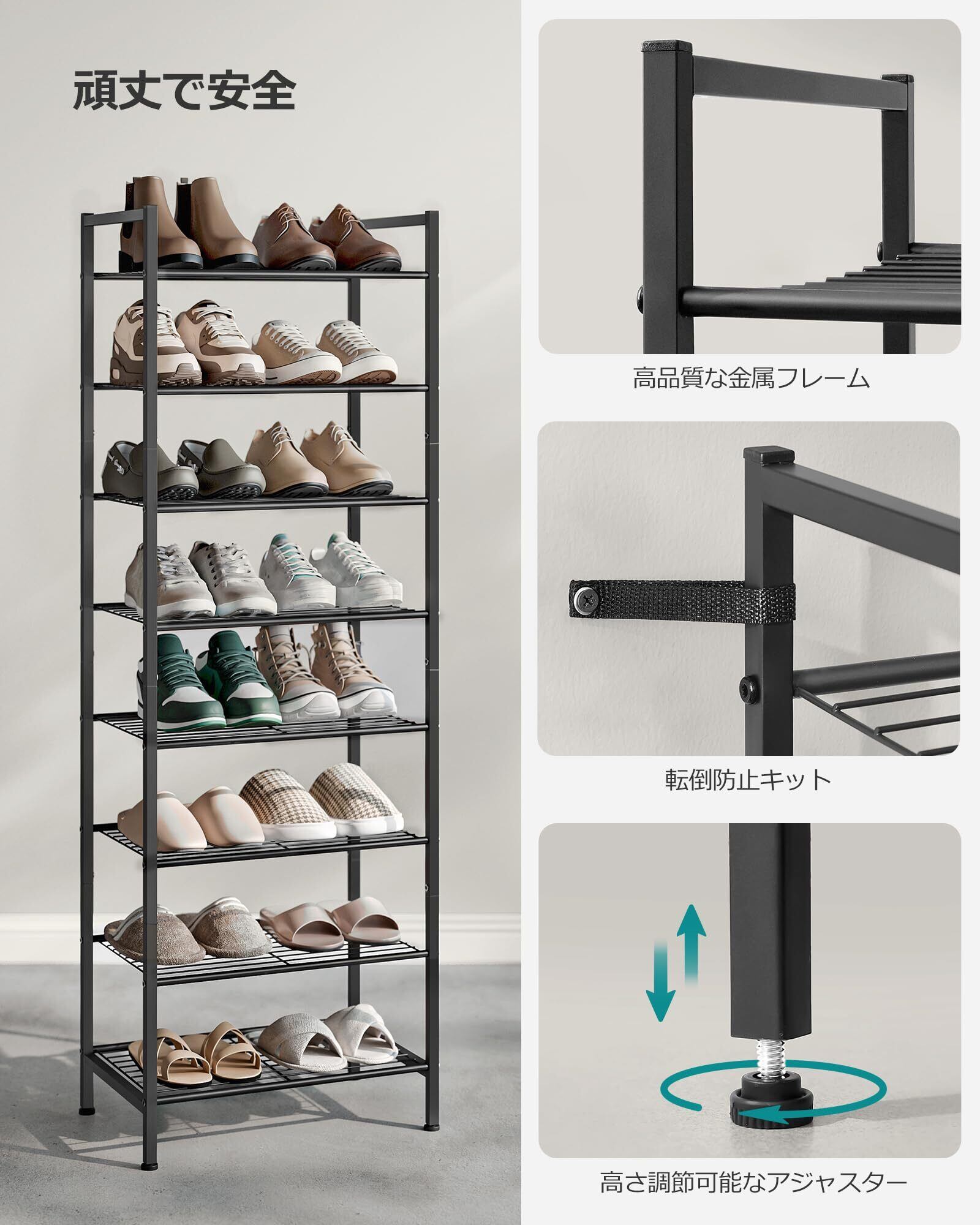 【高品質素材】この頑丈な靴整理棚は、厚さのある粉体塗装された鋼鉄と密度の高い錆や腐食に強いワイヤーで作られています。このスリムな靴ラックは、各棚ごとに耐荷重約13kgを保持し、靴が簡単に整理・収納できるように高い安定性を確保しています。