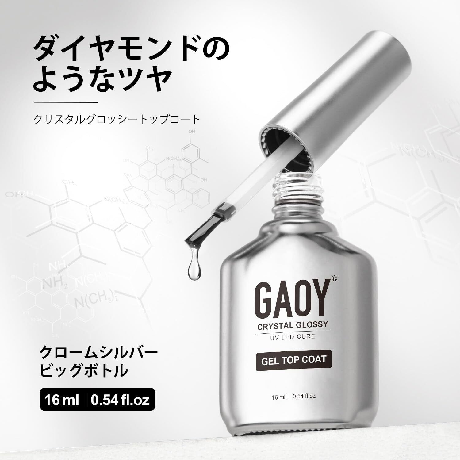 大容量:クリスタルグロッシートップジェル*1本(0.54 fl.oz 16ml/本)。ボトルはシルバーデザインを採用し、ステンレスのクールな質感が魅力です。