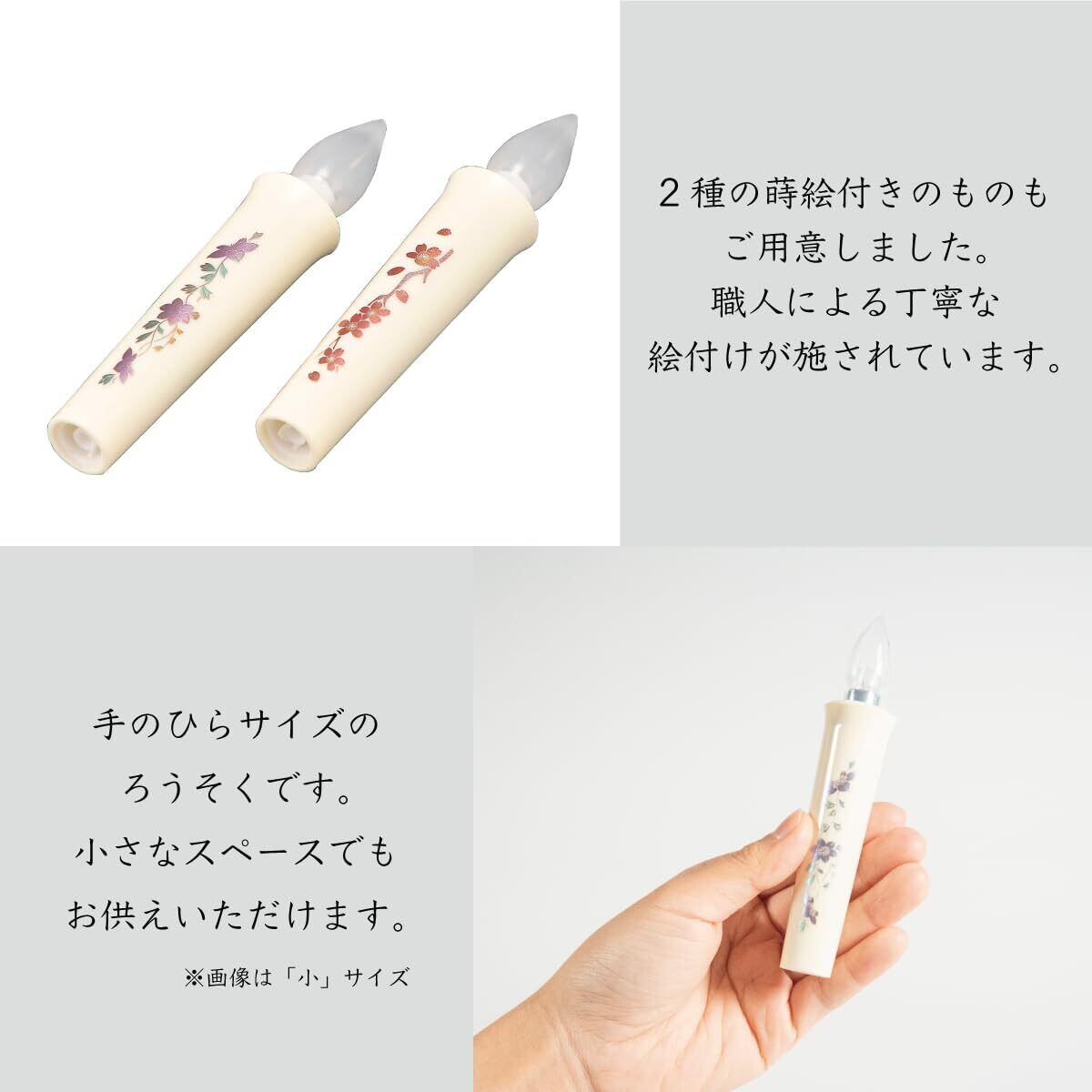 本体には、おりんや線香立て、お仏壇などほかの仏具をより一層ひきたてる蒔絵が施されております。火を使わないため、ロウを燃やした時の煙による有害物質の発生、また目を離した際の転倒、火災のリスクがありません。お子様やペットのいるご家庭でも、安全にろうそくの明かりでお仏壇を照らすことができます。エアコンや扇風機等、風で倒れても溶けたロウが飛び散らず、ろうそくが倒れても燃えないため、日々のお祈り、お参りに集中していただくことが可能です。