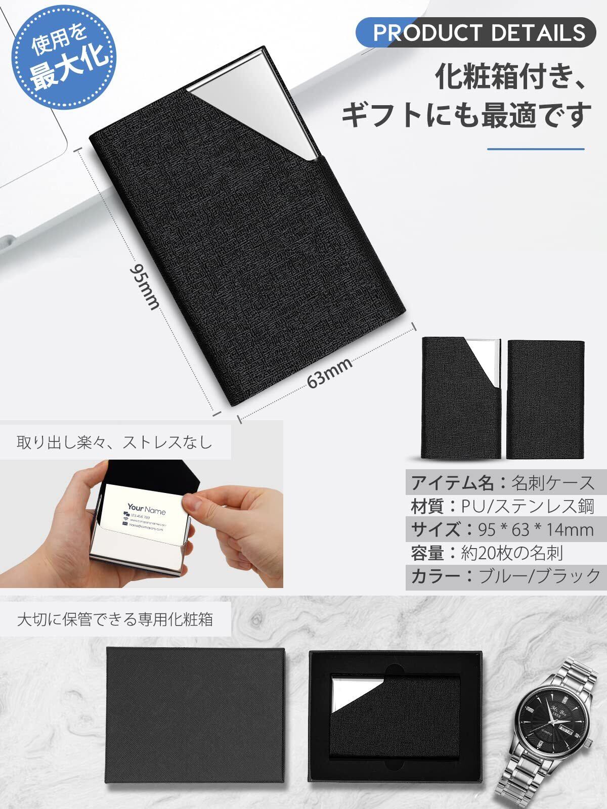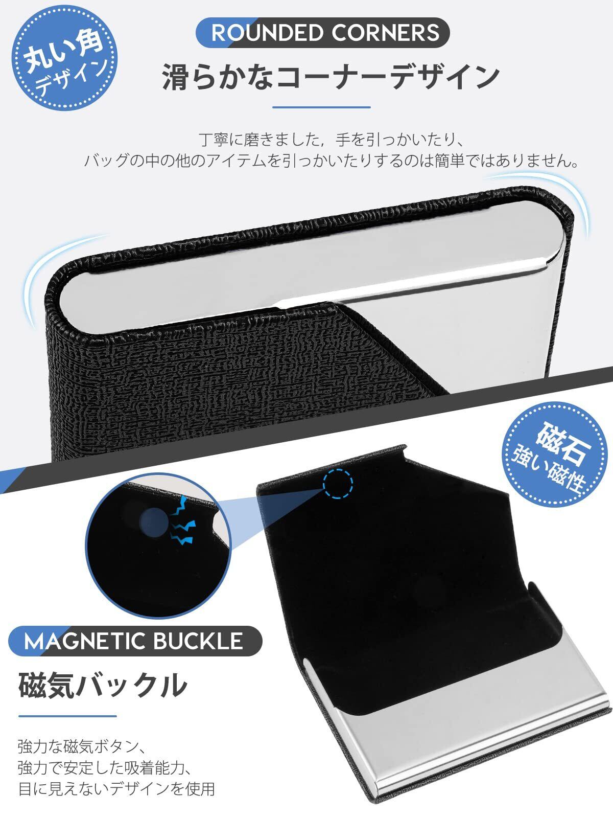 メイン素材: ステンレス+PUレザー、収納枚数:25枚前後(カードの厚みによって差異があります)、サイズ:9.5×6.5×1.3cm、・重量:約100g、留め具の種類: マグネット