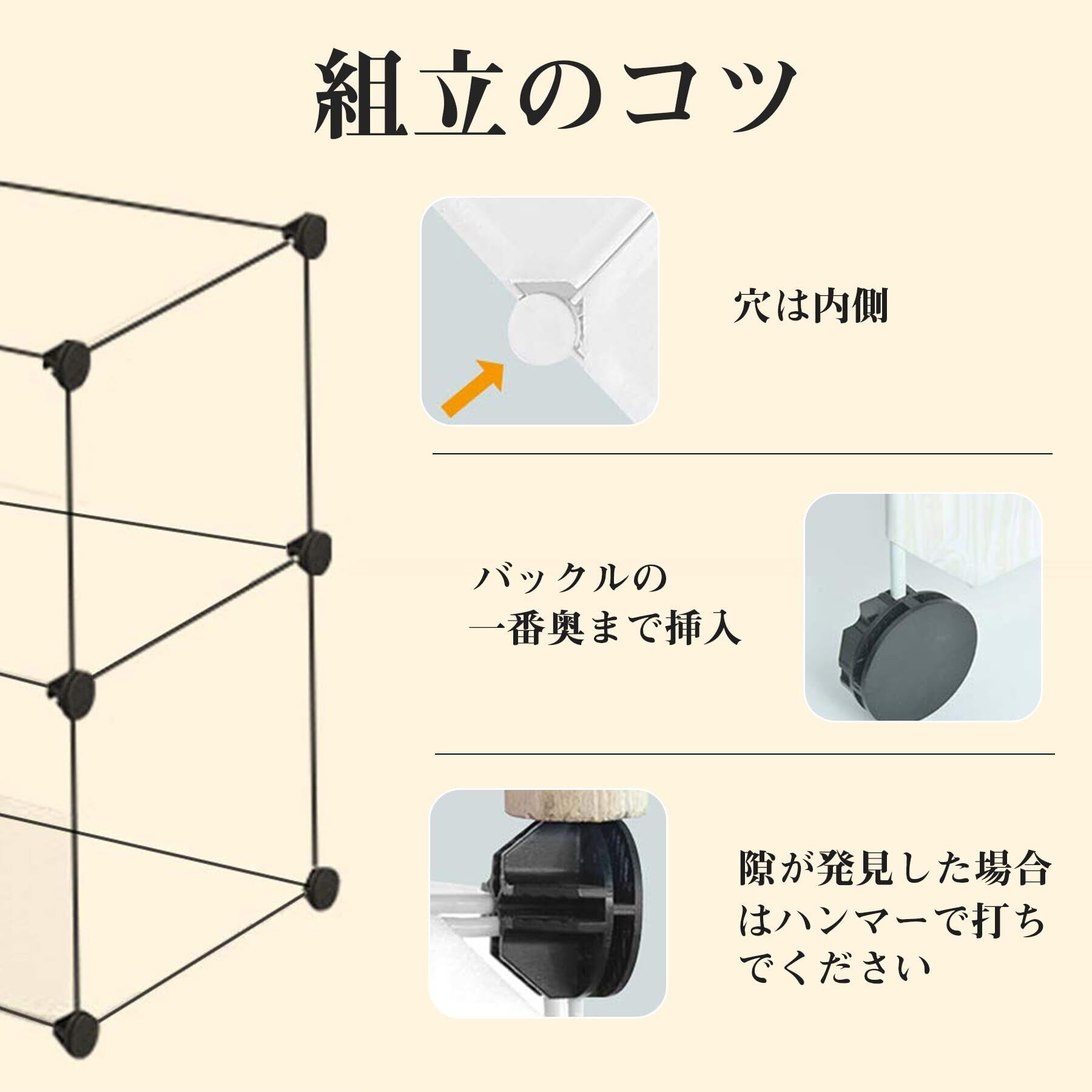 【組み立て簡単&自由度の高い収納ラック】用途に合わせて多様な収納スペースに対応することができ、コーディネートの楽しみが広がる。ねじを使う必要がなく、組み立てが簡単です。連結部材に棚板をはめ込むだけなので、女性一人でも簡単に組み立てることができます。自由度の高い収納ラックです。お好みにより、ラックの組合せがカスタマイズできます。