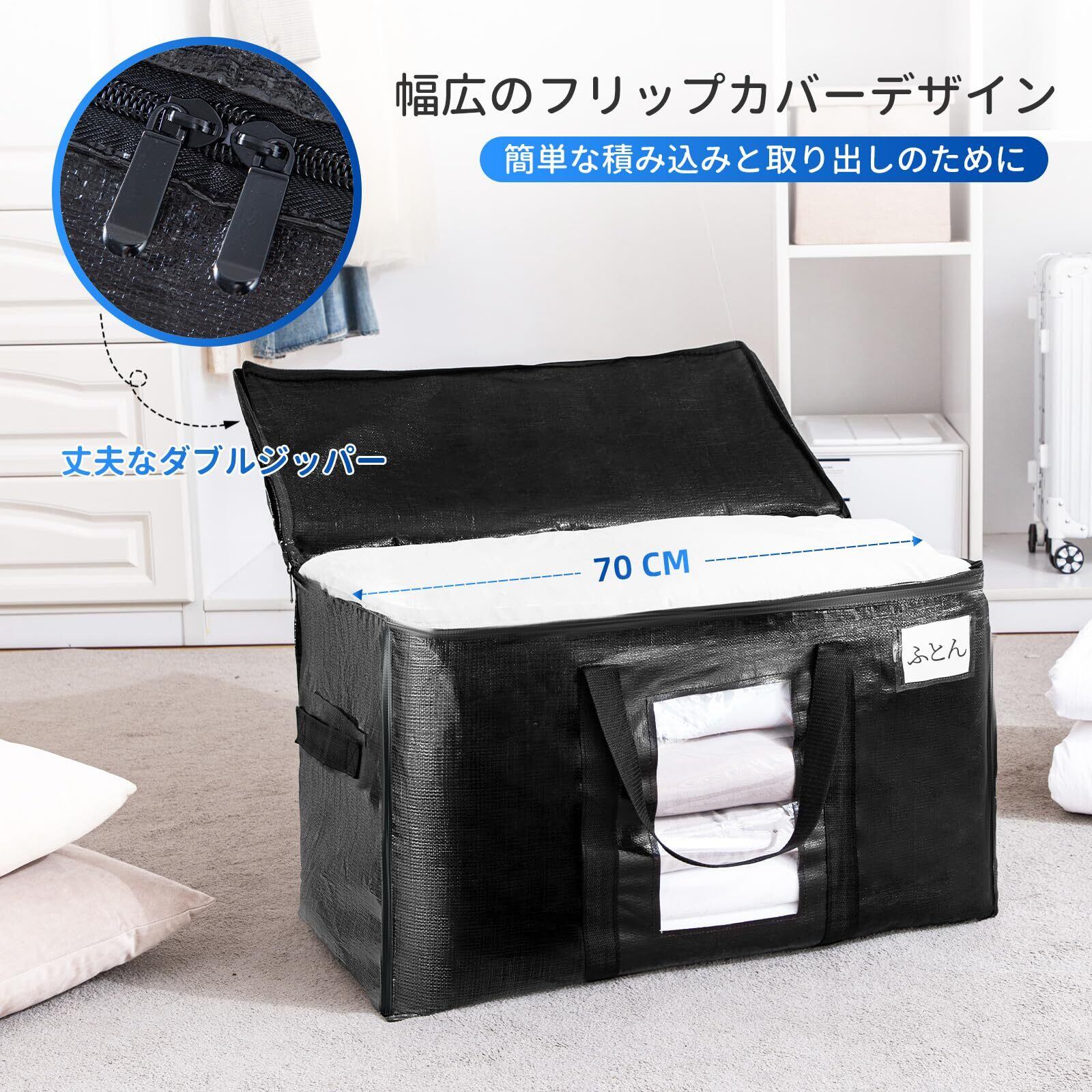 100L大容量、収納力抜群:抜群な特大引越しバッグの寸法:70 cm 35 cm 42 cm、4 パック。 両端のジッパーと中央に大きな開口部があるため、衣類、おもちゃ、靴、タオル、必需品、枕、寝具、シーツ、毛布、洗濯物、クリスマス飾りなどを簡単に収納できます