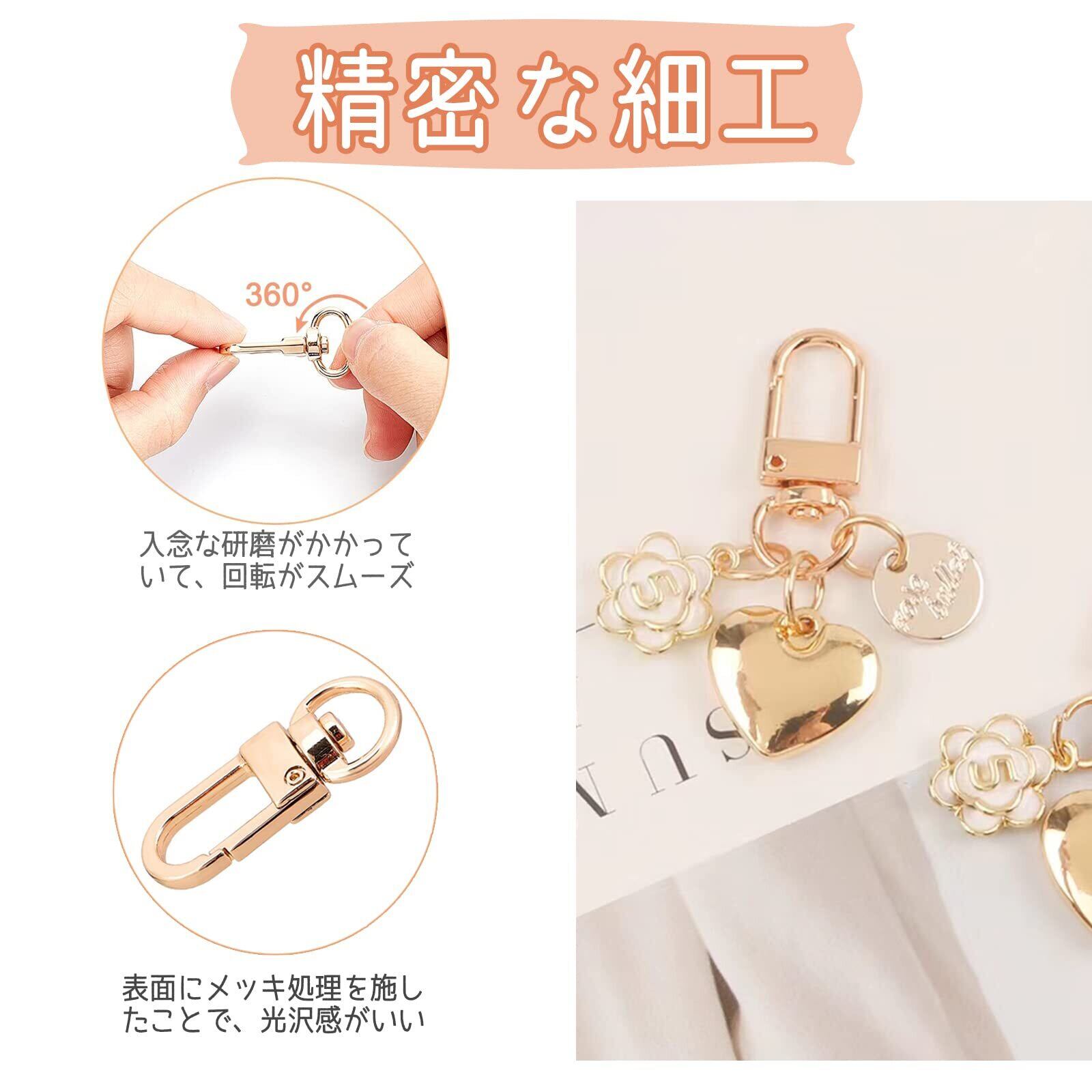 【回転丸カンとワンタッチ】360度回転する丸カンが備わったキーホルダーパーツなので、取り付けるときに表裏を探さなくても、いつでもどこでも取り付けることができます。そのおかげで、ねじれてモノが壊れることもありません。ナスカンは回転がスムーズで、カートンすることもなく、自分の作業をいろいろな角度から見ることができます。ワンタッチで取り付けられるキーホルダーなので着脱が簡単で苦労しません。
