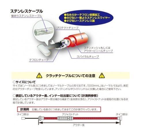 ステンレスケーブルはインナーケーブル高密度の複撚り(7×7=49本)に仕上げ、高張力加工、表面特殊加工を施した為、表面の凹凸が少なく、テフロンチューブ内蔵により、摩擦を減少させ、非常に滑らかなクラッチ、スロットルワークを実現しています。