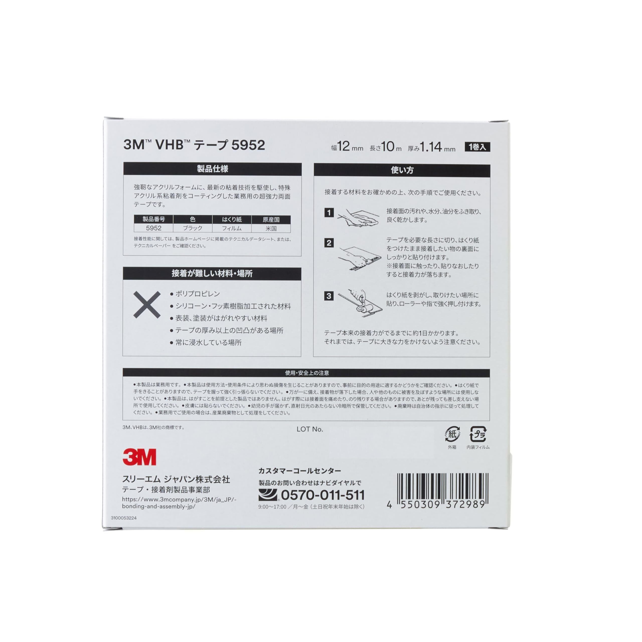 3M VHB テープ 粗面 5952, ブラック, 幅12 mm x 長さ10 m, 厚み1.14 mm, 個装