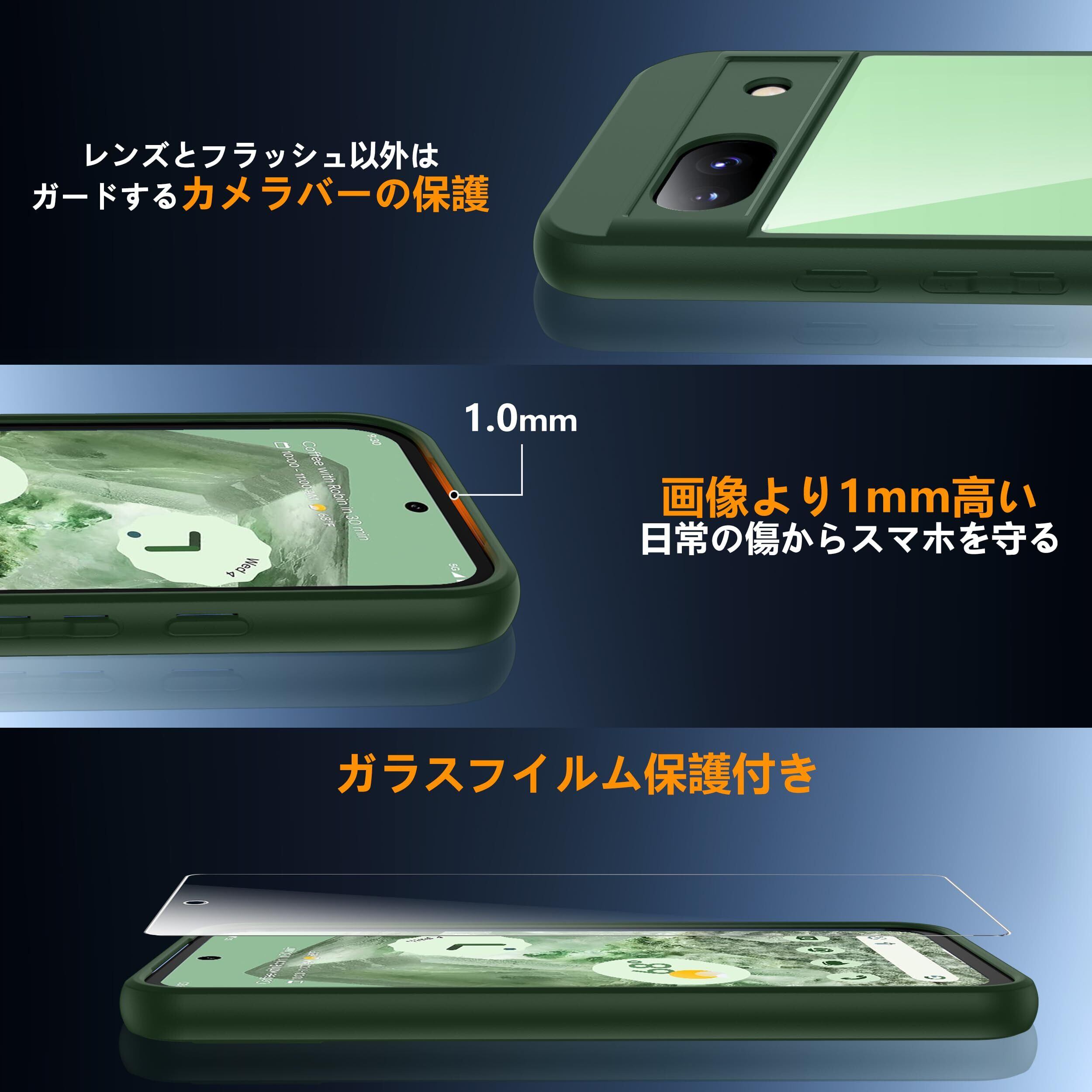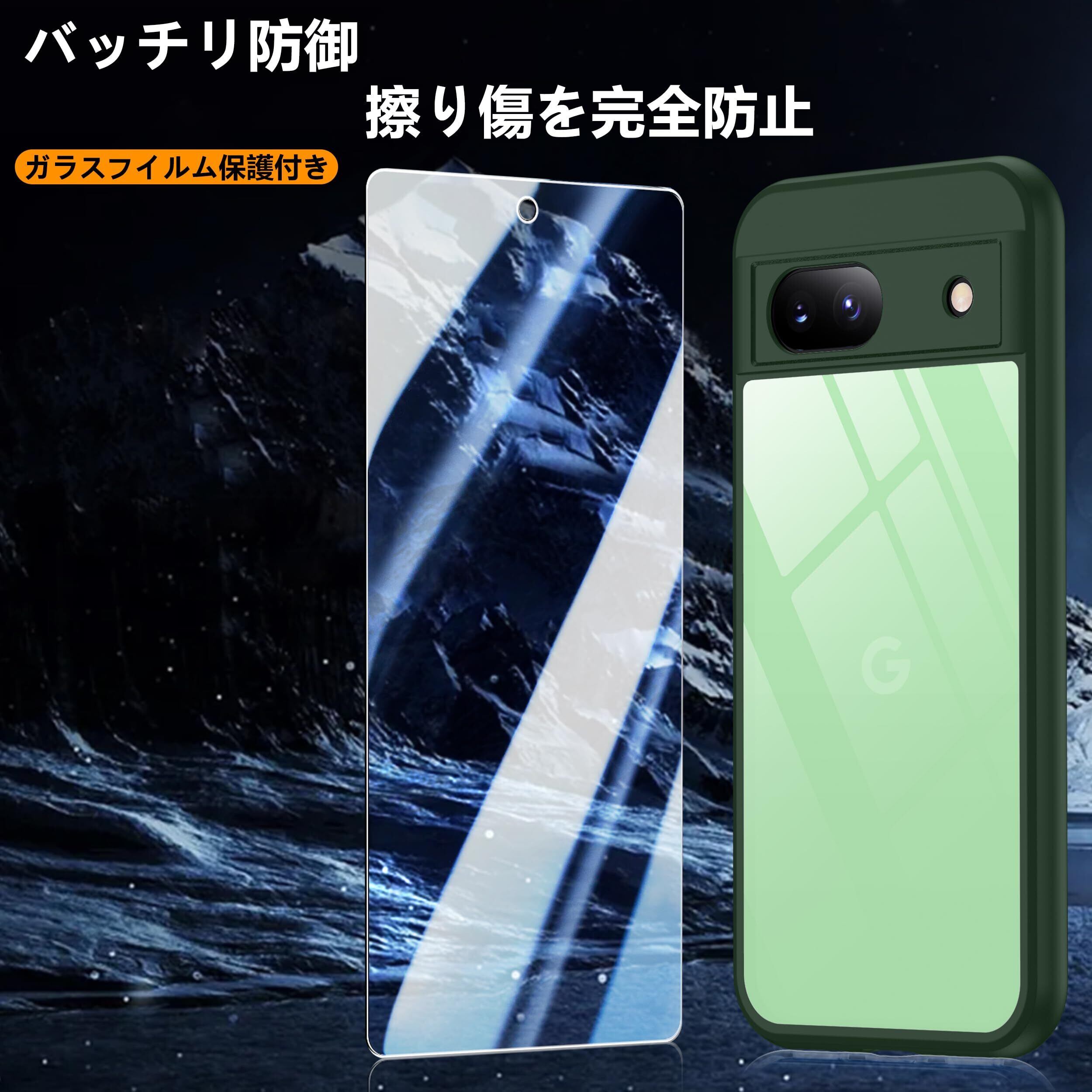 Google Pixel 8a ケース グリーン 黄変防止 グーグルピクセル8a ケース 耐衝撃 ガラスフイルム保護付き 指紋防止 落下防止 耐久性 ストラップホール付 薄型 軽量 ソフトカバー ワイヤレス充電対応 googleピクセル8a
