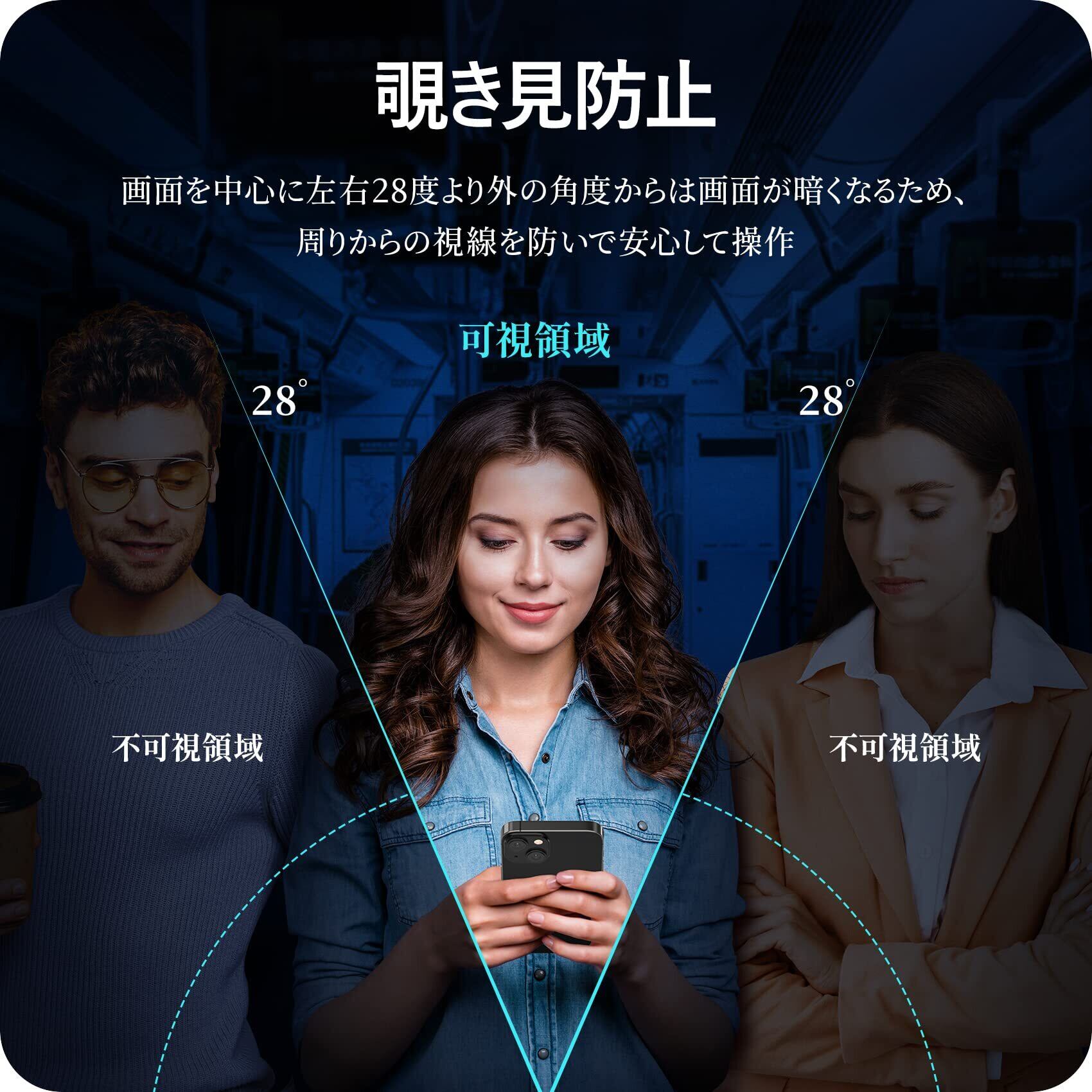 覗き見防止仕様 ▏覗き見防止技術により、視野角度が左右約28°となり、28°を超えると画面が暗くなり、プライバシーを守ります。例えば、電車やバスの中でメッセージを見ていたら、隣の人に覗かれていたという心配がなく、LINEやメール操作の際も安心です。また、本製品は斜めから見るとブラインドルーバーにより画面が真っ黒になりますが、真正面から見ると高透過率ではっきり見ることが出来ます。