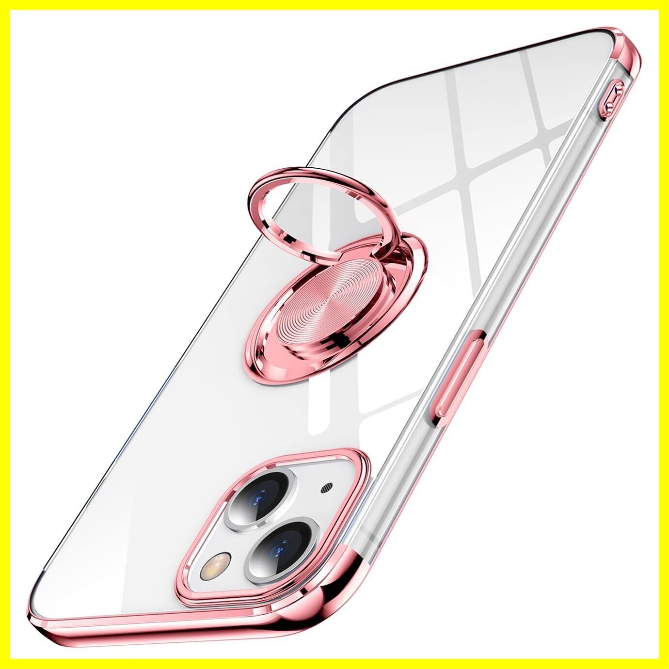 iPhone 14 用 ケース クリア リング付き アイホン 14 カバー 透明 おしゃれ OURJOY スマホケース メッキ加工 ソフトケース 耐衝撃 軽量 薄型 ストラップホール付き スタンド機能 車載ホルダー対応 携帯ケース • ローズゴールド