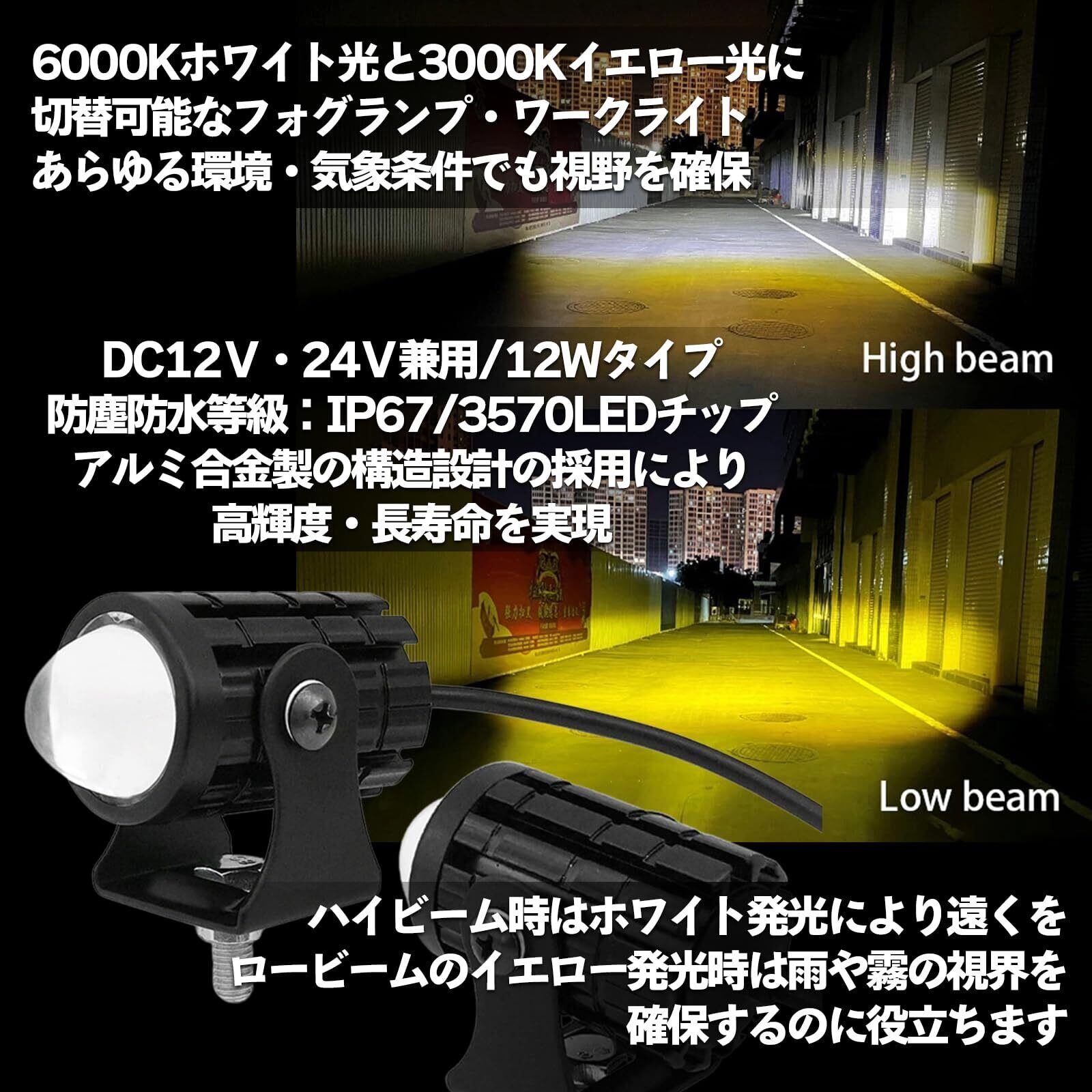 HTharros バイク 用 フォグランプ LED ライト 汎用 12W 作業灯 ワークライト 黄 白 切替 12V 24V 兼用 高輝度 防水 2個セット