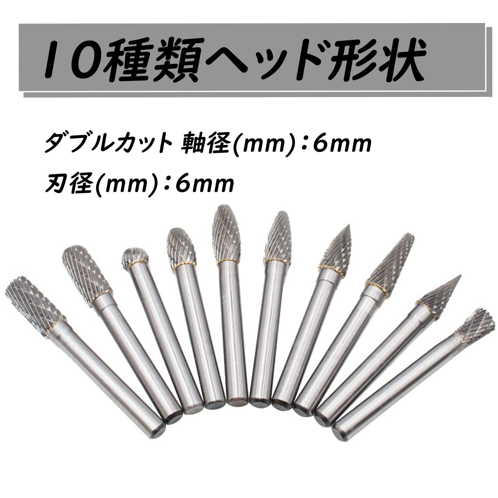 セット内容:10本組ロータリーバー タイプ:ダブルカット 軸径(mm):6mm 刃径(mm):6mm 色: シルバー