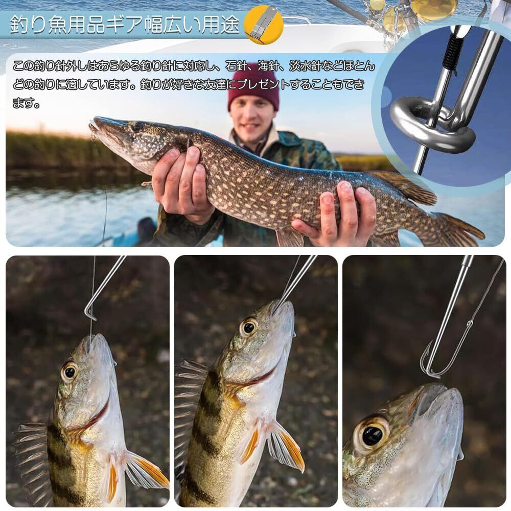 ステンレス製フックピッカー:釣り糸の周りにフック取り外しツールを持ち、釣り糸に沿って魚の口に入り、フックを見つけ、フックの下部を引っ掛け、手を怪我しないように引っ張って素早くフックを取り外すだけです。