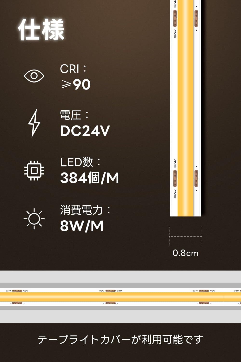 【仕様】幅:8mm;電圧:24V; LED数:384個/M;消費電力:8W/M;ご注意:ブラグなし