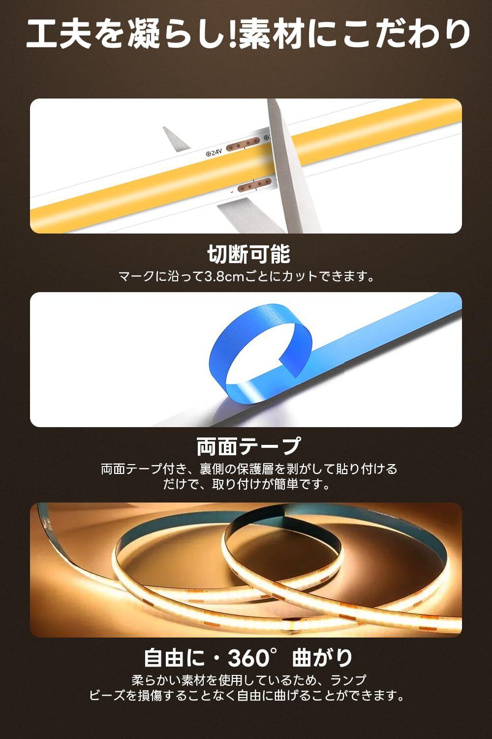 【高輝度】COB テープライトには 1 メートルあたり 384 個の LED があります。従来の SMD テープライトと比較して、ランプビーズの密度が高く、より明るく柔らかい光を生成するため、装飾照明に非常に適しています。ご注意:プラグなし