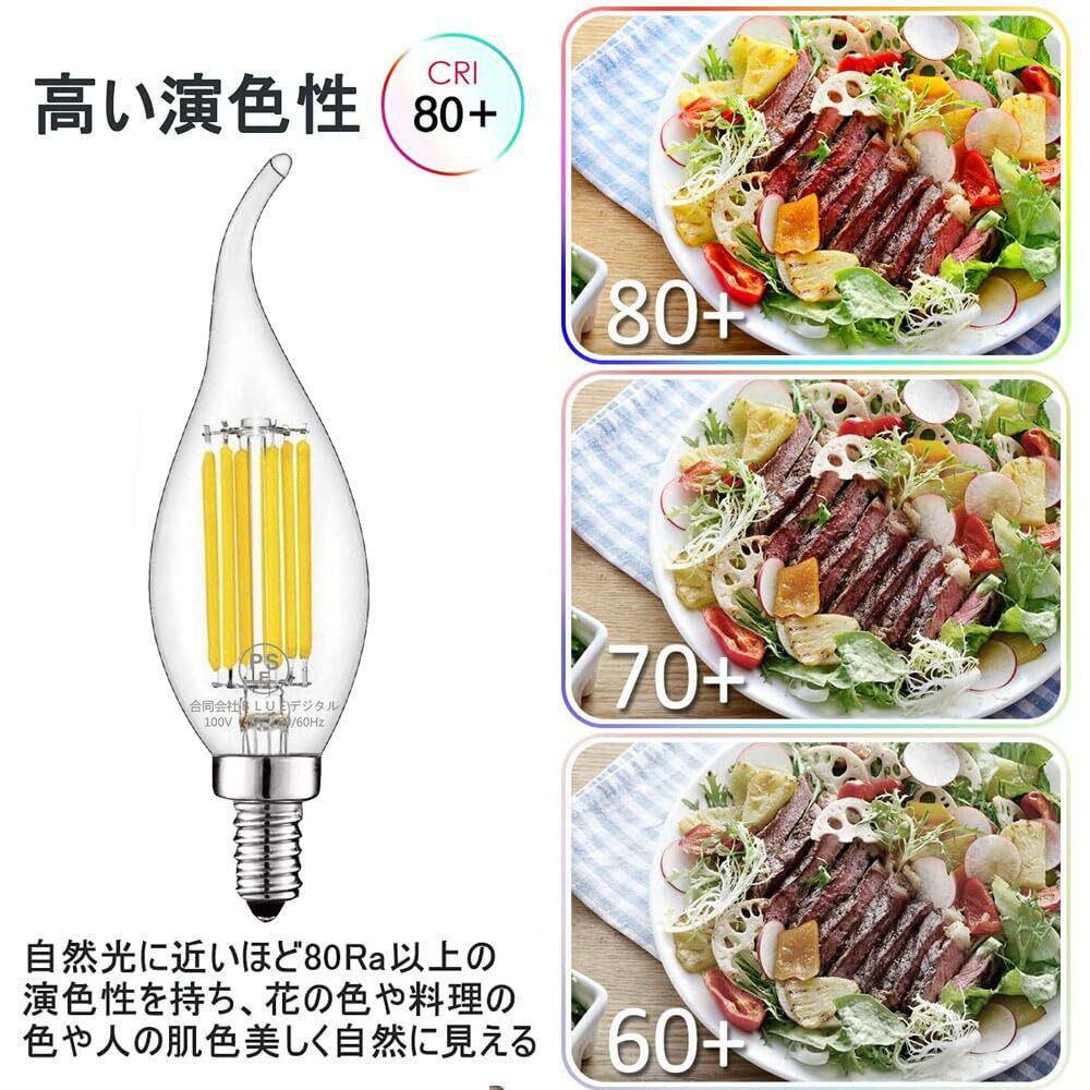 【全方向に360度発光します】 –物をキレイに見せる高演色≥Ra80で、従来のLED電球では表現できなかった優しい光を、白熱電球のように全方向に発光し、しっかり明るいLEDシャンデリア電球です。