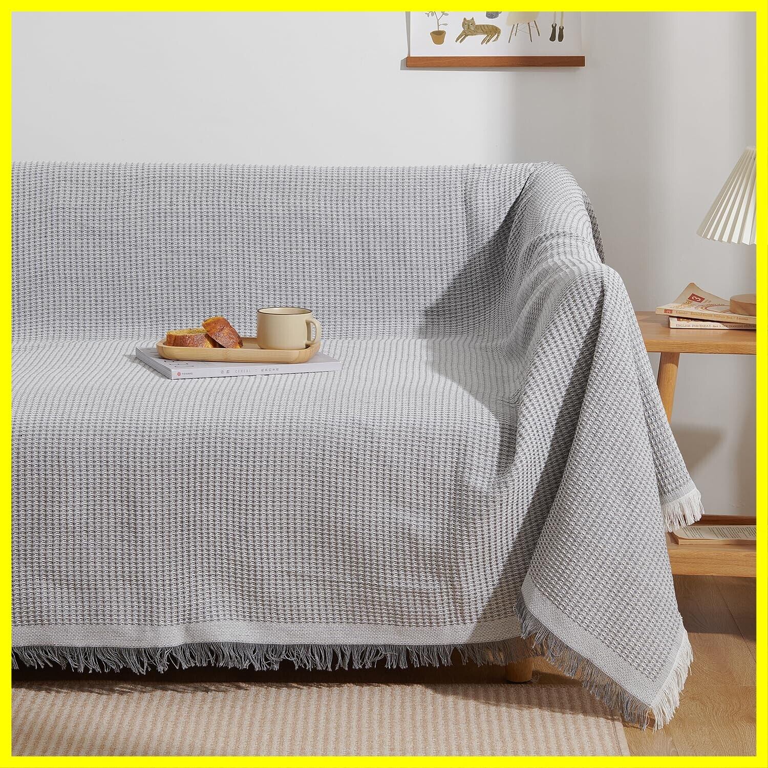 Atokazo ソファーカバー 北欧風 マルチカバー ソファカバー 肘付き 肘なし 多機能 ブランケット 綿 リバーシブル フリンジ付き おしゃれ 保護カバー 防塵 キズ防止 汚れ防止 洗える 四季通用 グレーホワイト・ワッフル柄 90X180cm(1人掛け)