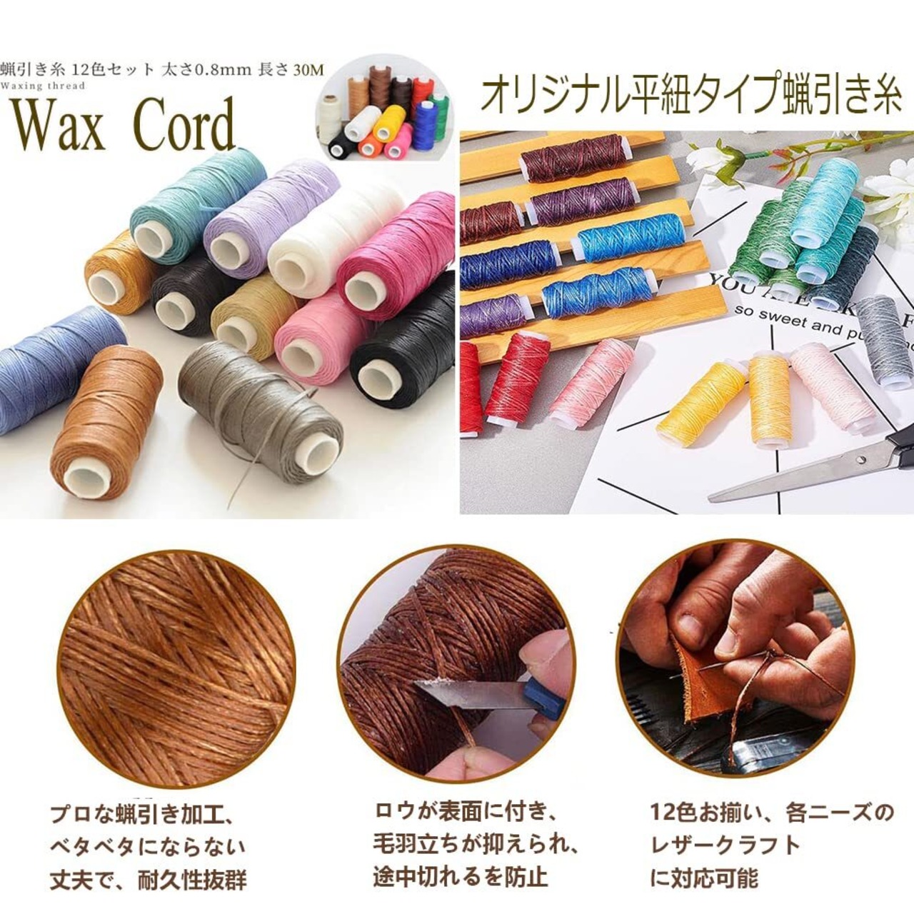 【高品質ワックスコード】 糸の中にしっかりロウが入っているので、通常のナイロン糸より強度も強く無駄に多量のロウが表面についていない為、縫いやすくまた縫った糸の発色も良くなるように加工してあります。麻糸よりもすれに強く、縫った時から毛羽立つような事はないです。