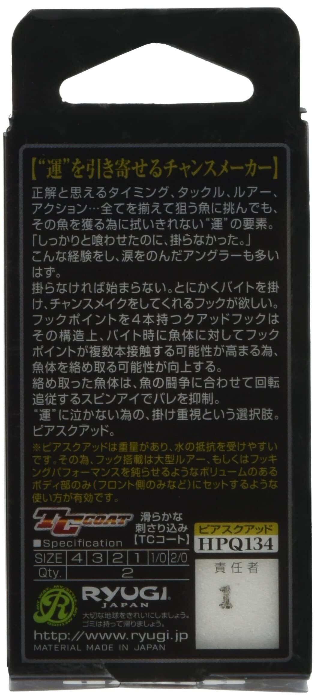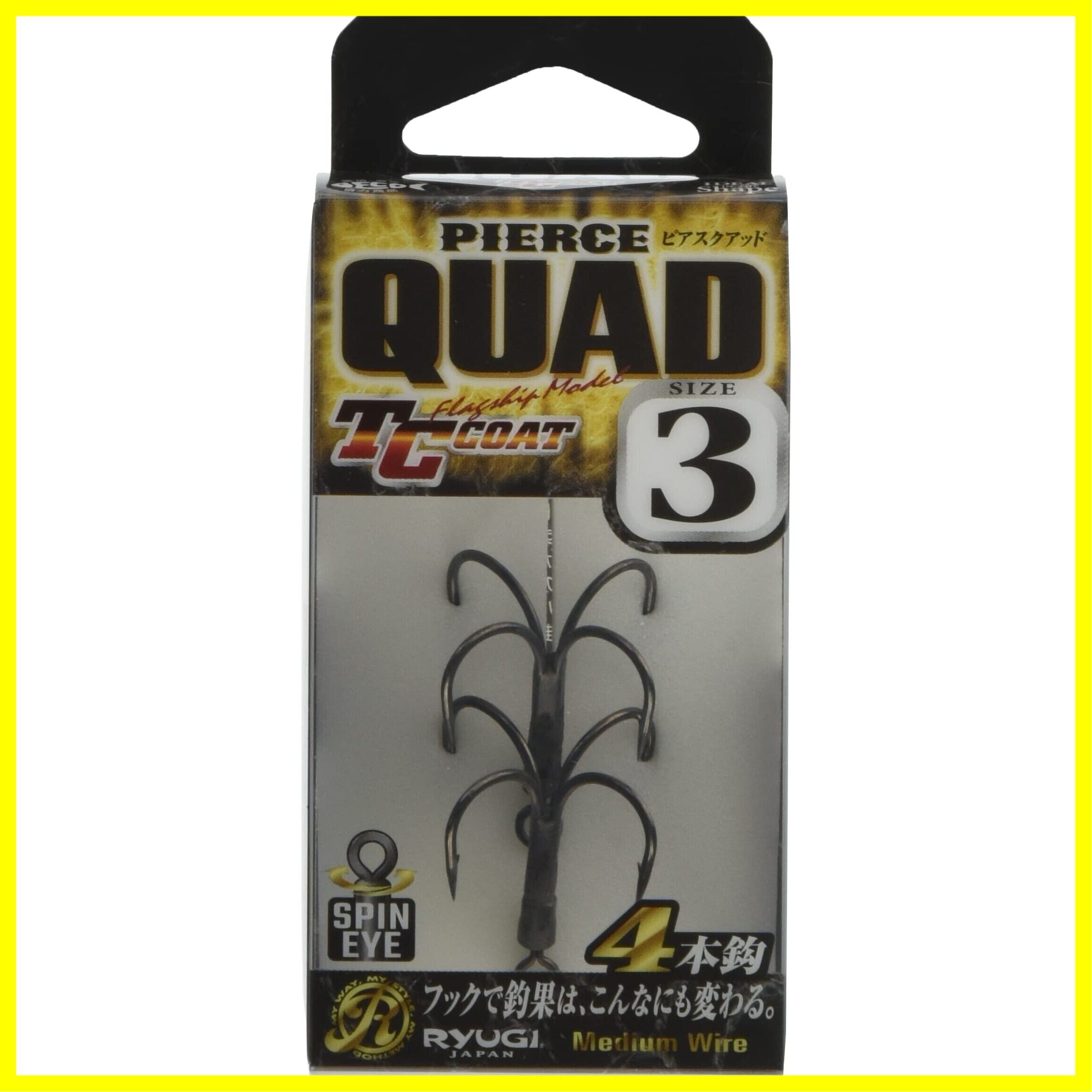 ピアストレブルの形状を受け継いだワイドゲイプ設計の4本鈎、ピアスクアッド。異次元の貫通力を生むTCコート。軸線径を細軸化することによりバイトを掛けることに特化した。掛けてからは360°回転追従するスピンアイでバレを抑制。"運"に泣かないための掛け重視という選択肢。