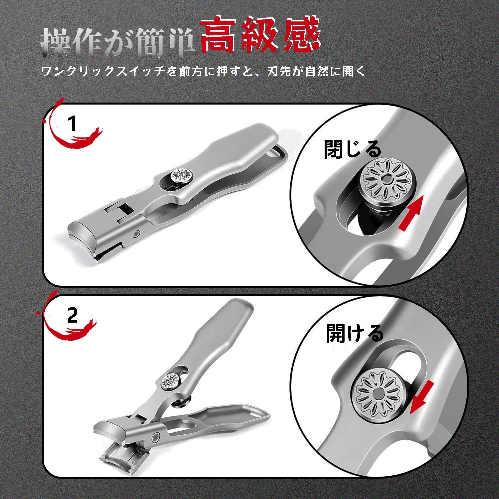 【ワンクリックスイッチで操作が簡単:高級感】ワンクリックスイッチを前方に押すと、刃先が自然に開く。また、持ち手がしっかり手にフィットし、滑らず、握り心地の良い優れた設計がなされています。そのため、使いやすく、爪や爪周辺の皮膚を傷つけずに安全に爪切り処理が可能です。