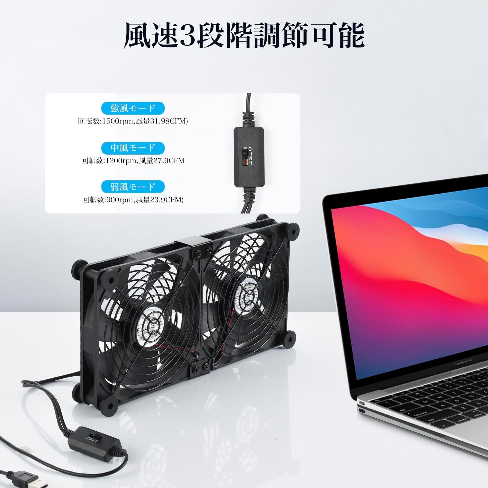 【7枚羽根&3段階風速調節可能】usbファン 2連 14cmは7枚羽根で安定した風量を確保します。面倒な配線が無く、USBインターフェースを採用して、プラグを差し込んで使用できます。風速調整スイッチを備えて、風量は3段階で調節可能。電圧:5 V 風回転数:900/1200/1500RPM。ご注意:5Vを超える電圧が禁止。