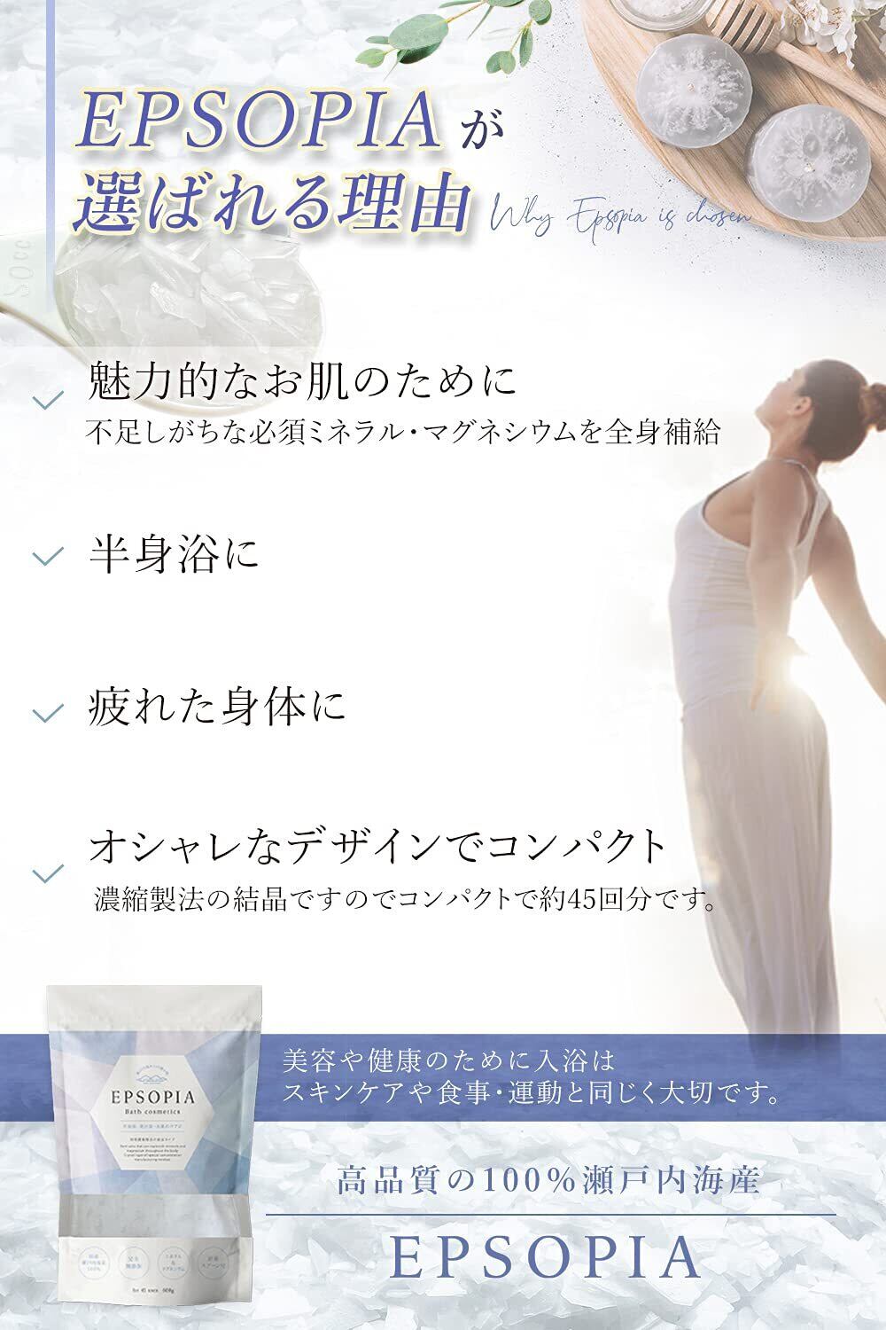 【EPSOPIAが選ばれる理由】魅力的なお肌のために不足しがちな必須ミネラル・まぐねしうむを全身補給半身浴にもオススメです。マグネシウムの温浴で汗とともに・・・疲れた身体に入浴後は心身を和らげぐっすり睡眠が期待できます。オシャレなデザイン濃縮製法の結晶ですのでコンパクトで約45回分です。美容や健康のために入浴はスキンケアや食事・運動と同じく大切です。