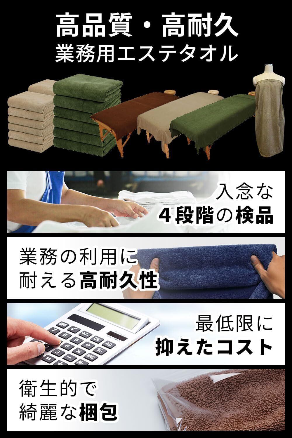 【 エステサロン・整体院・マッサージ・リラクゼーションサロン等に最適な業務用タオル 】 ■ サロン様のご要望を基に改良し、よりエステサロンに最適なタオルに仕上がりました。 ■ 薄手で速乾性が高く、更に吸水力が高く生地がしっかりしているので、業務用タオルとして最も適しております。