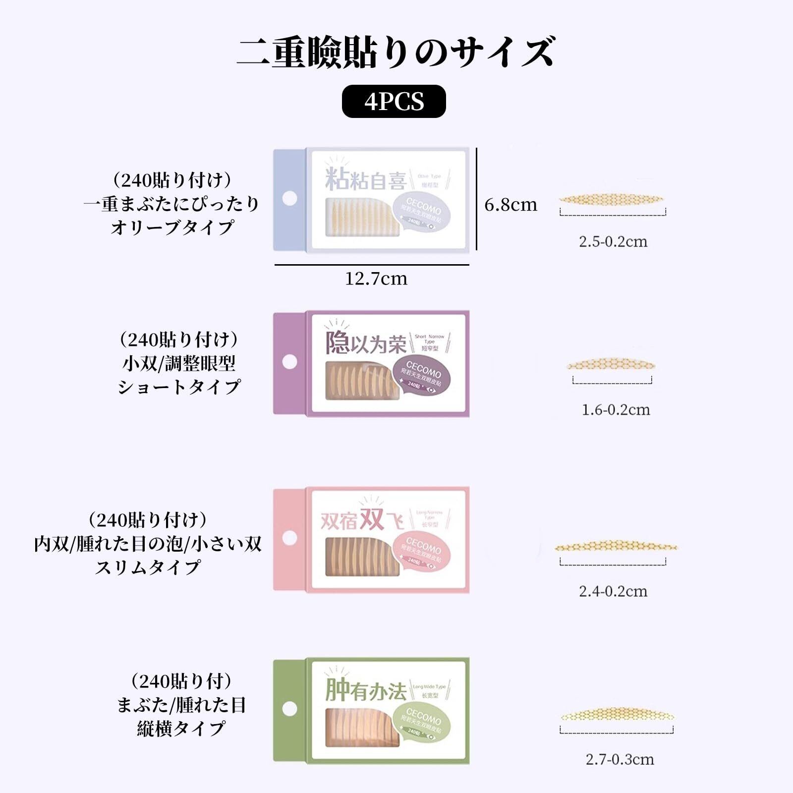 まぶたテープ 二重テープ (4タイプ混合 960枚) アイテープ 両面 アイテープ メッシュ 透明 極細 肌色 強力 粘着力 目立たない テープ