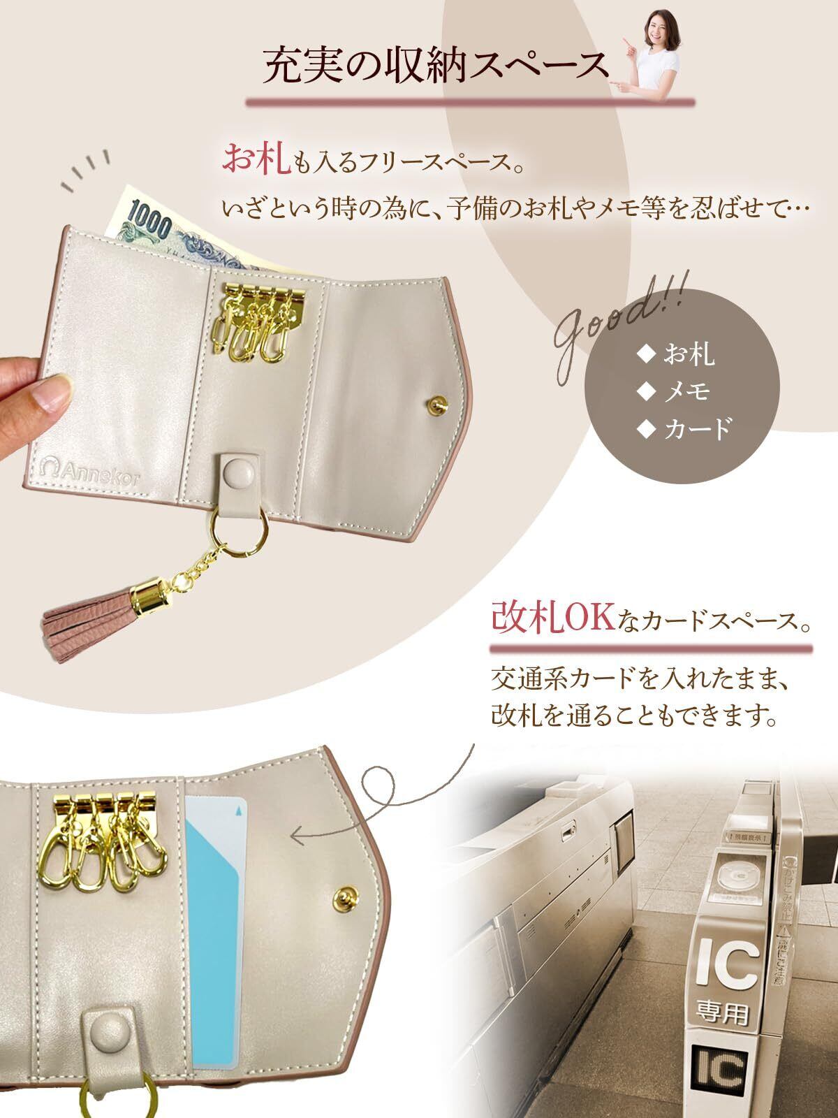 【脱着可能なキーリング&タッセル】 車のリモコンキーや家の鍵をつけられる取り外し可能なキーリングを採用。玄関のキーフックにも簡単にかけられ、上品なタッセル付きでアクセントにもなります。