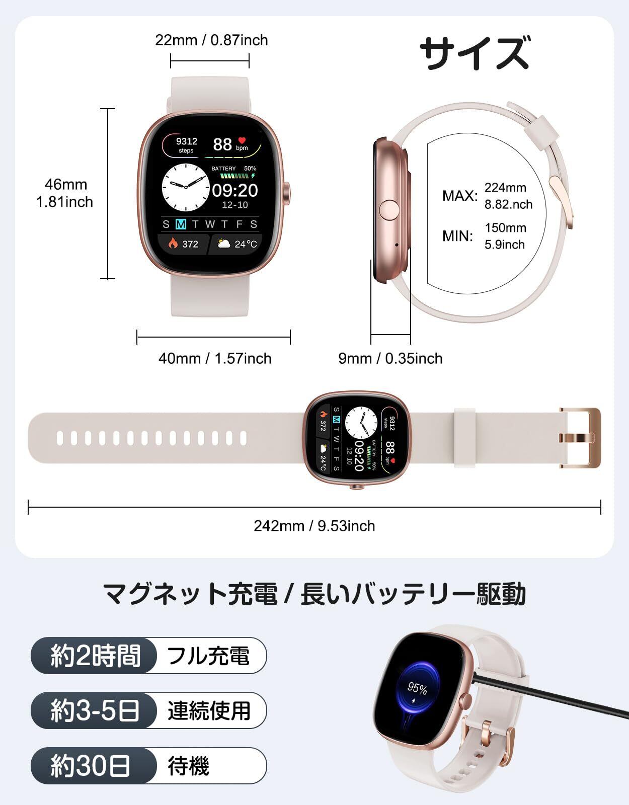 【1.83インチHD画面・DIY文字盤】1.83インチのフルタッチスクリーンは、鮮明で高解像度のビジュアル体験とスムーズなタッチ操作を提供し、使いやすさをさらに高めています。 このスマートウォッチは、軽量で薄型のデザインに滑らかなダイヤルラインを採用し、一日中つけていても快適な、洗練されたスタイリッシュな外観を実現しています。さらに、200種類以上の豊富な文字盤の中から、自分好みの写真をDIYすることも可能です。スタイルや気分に合わせて毎日異なるデザインを楽しむことができ、時計をよりパーソナルなオブジェにすることができます。自分だけのスマートウォッチを作成しましょう!