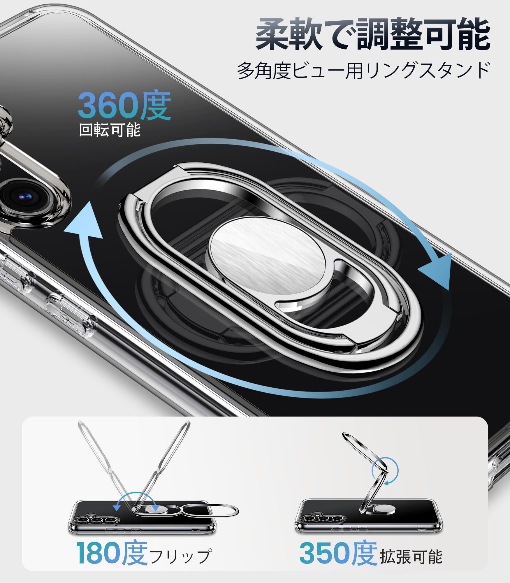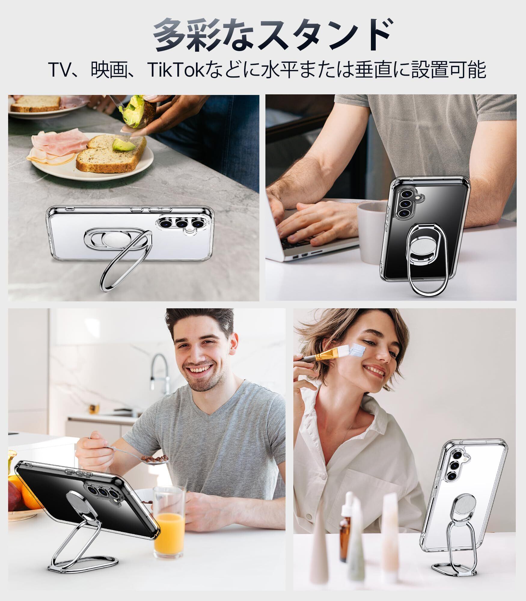 【自由に回転するリングスタンド】 このSamsung Galaxy A54 5Gのケースには、360°回転するベースと、それぞれ最大180°および350°まで調節可能な2つのアームが搭載されています。多彩なハンズフリー視聴オプションを提供します。