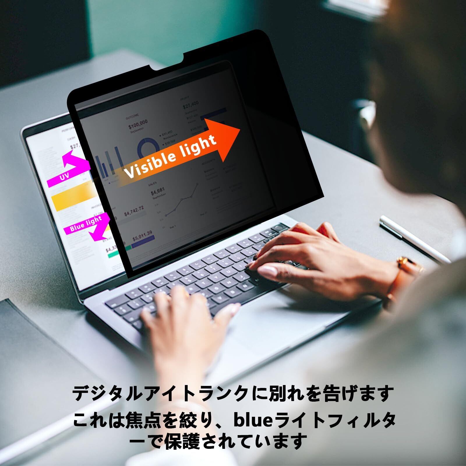 プレミアムプライバシーフィルターとブルーライト防止フィルター - プライバシーフィルターは、コンピューター画面上のすべての情報をプライベートに保ち、紫外線放射を最大 96% 最小限に抑え、ブルーライトを 70% 削減するブルーライト防止コーティングが含まれています。 画面上のプライバシーを確保しながら、不眠症、目の疲れ、頭痛の心配はもうありません。