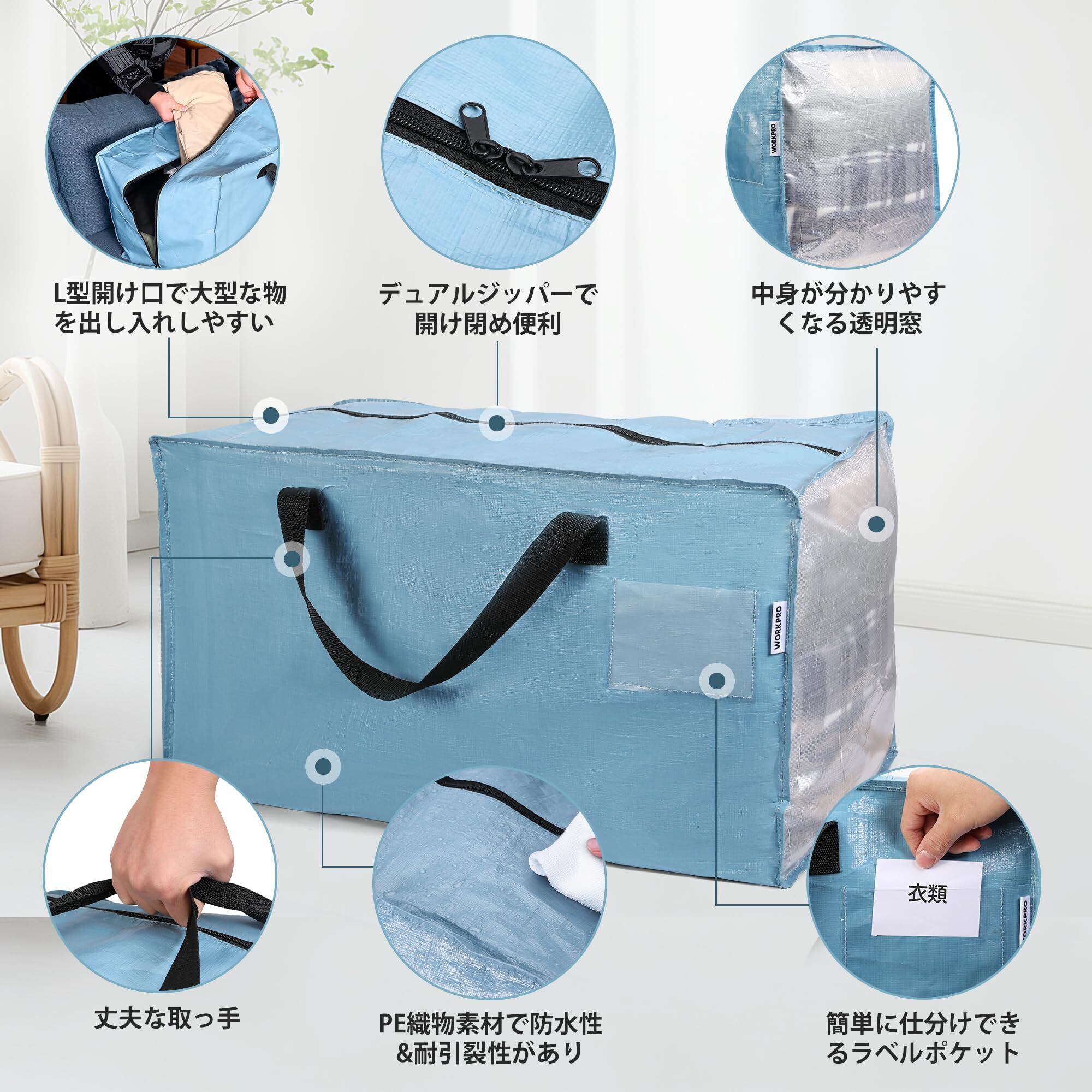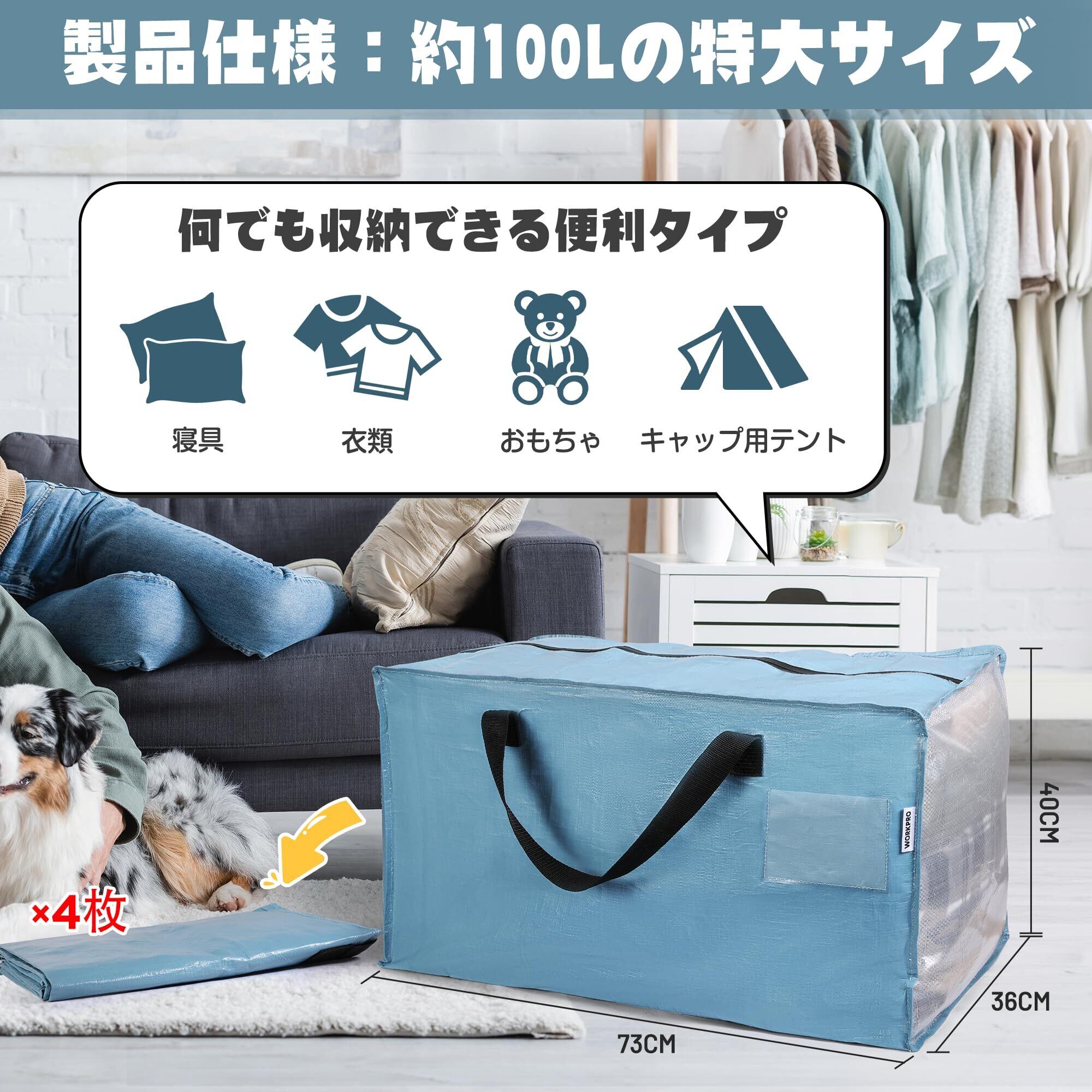 WORKPRO 布団収納バッグ 引越しバッグ 大型収納袋 大型収納カバン 100L大容量 73*36*40CM 耐荷重22.7KG 背負える仕様 持ち手付き 布団 衣類収納袋 透明窓 防塵 防水 引っ越し キャンプ 旅行 収納用 4枚セット