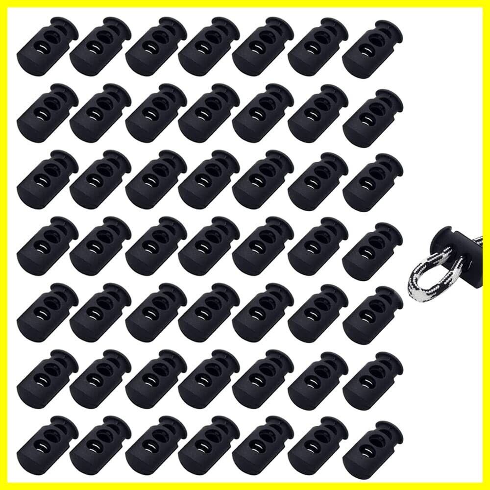 サムコス スプリング コードストッパー 50個入り 2つ穴 穴径約6mm 紐止め 交換 補修用 衣類 リュックサック 運動服など ロープ ストッパー (ブラック 樽型)